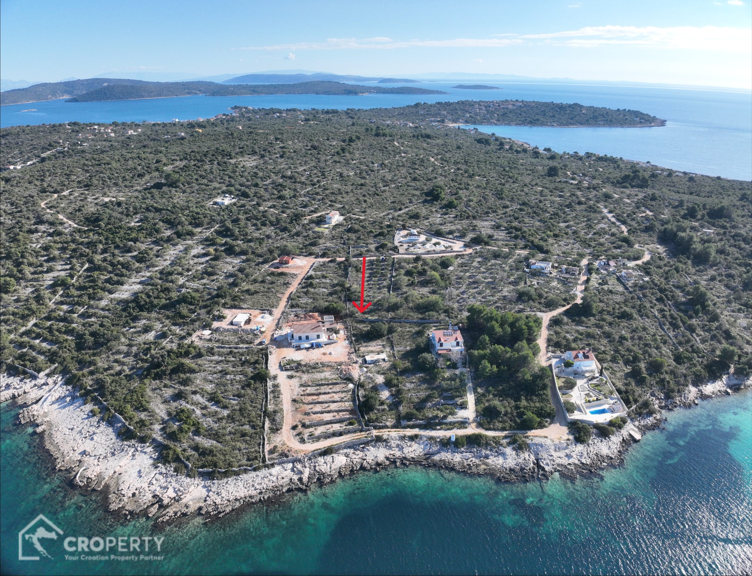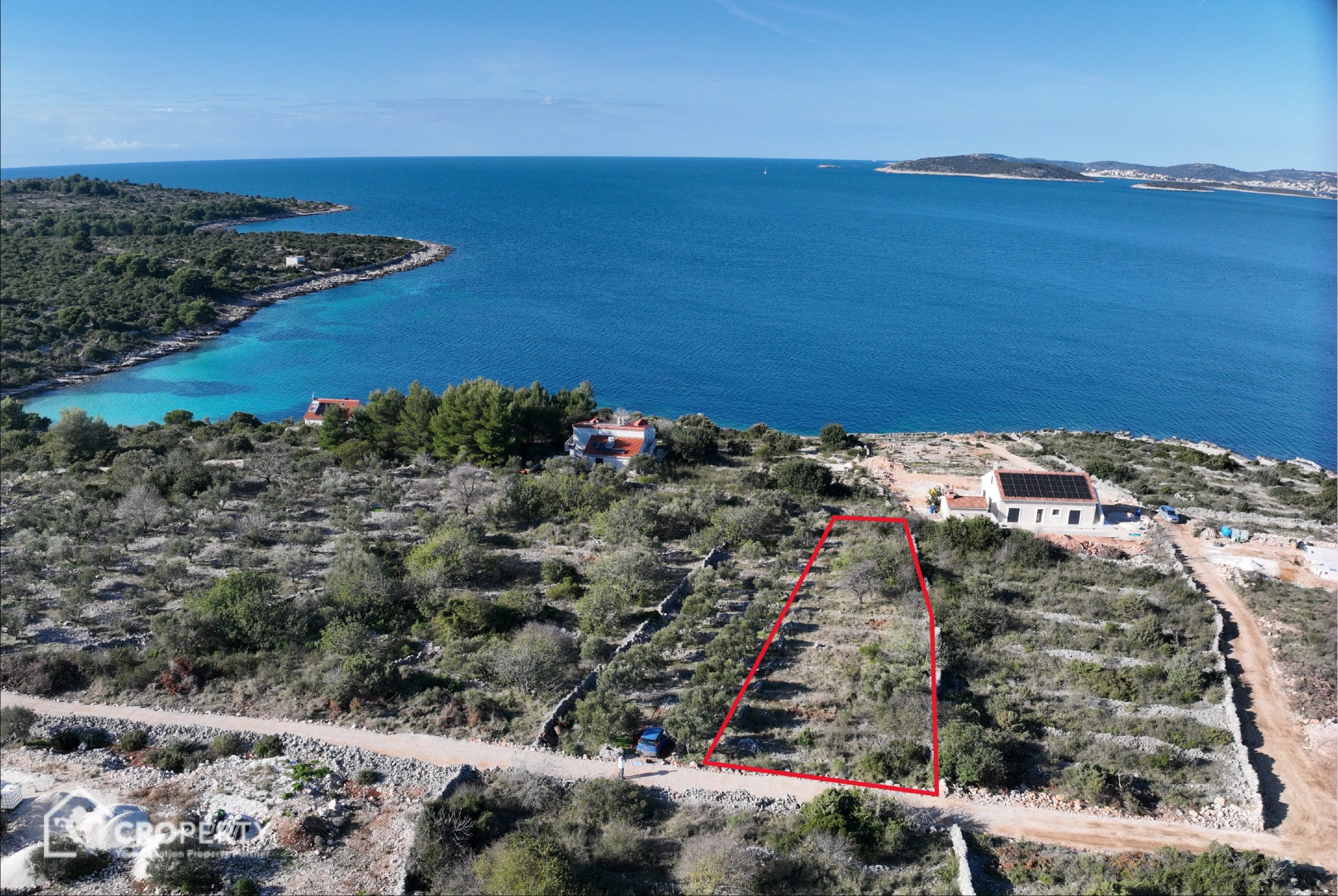 Zemljište površine 1000 m² pravilnog je, pravokutnog oblika, blagog nagiba i jugozapadne orijentacije, što osigurava obilje sunčeve svjetlosti tijekom cijelog dana te prekrasan pogled na more. Okruženo je maslinicima i netaknutom prirodom, pružajući potpuni mir i privatnost.