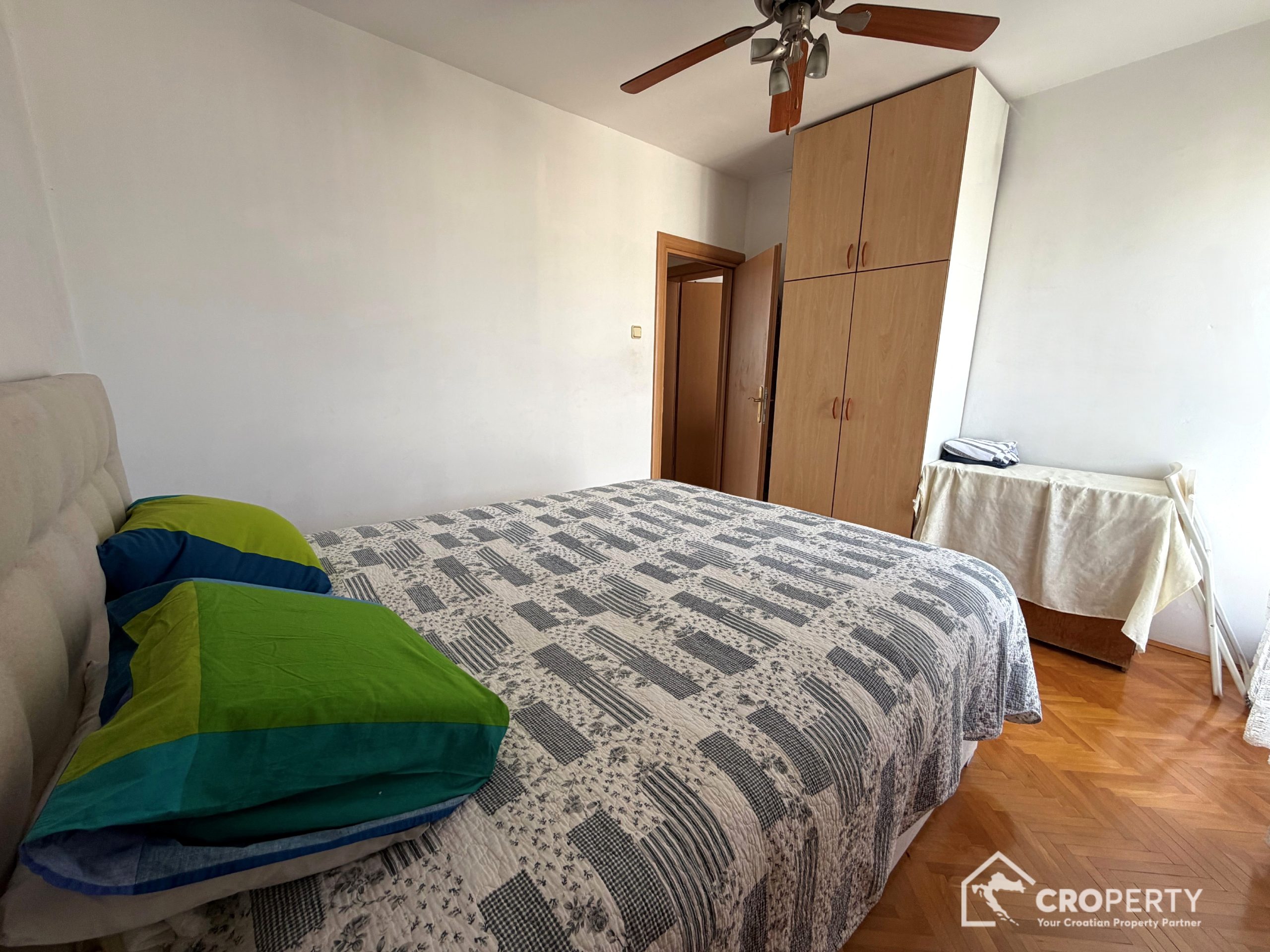 Stan se sastoji od dvije spavaće sobe smještene na sjevernoj strani, što osigurava ugodniju temperaturu tijekom toplijih mjeseci. Svaka soba ima izlaz na vlastitu manju lođu. Dnevni dio stana nalazi se na južnoj strani i uključuje zaseban dnevni boravak te blagovaonicu povezanu s kuhinjom. Iz blagovaone se izlazi na prostranu južnu lođu koja pruža obilje prirodnog svjetla i ugodan prostor za boravak na otvorenom. Stan također ima kupaonicu te dodatni mali wc, što dodatno doprinosi praktičnosti svakodnevnog korištenja.