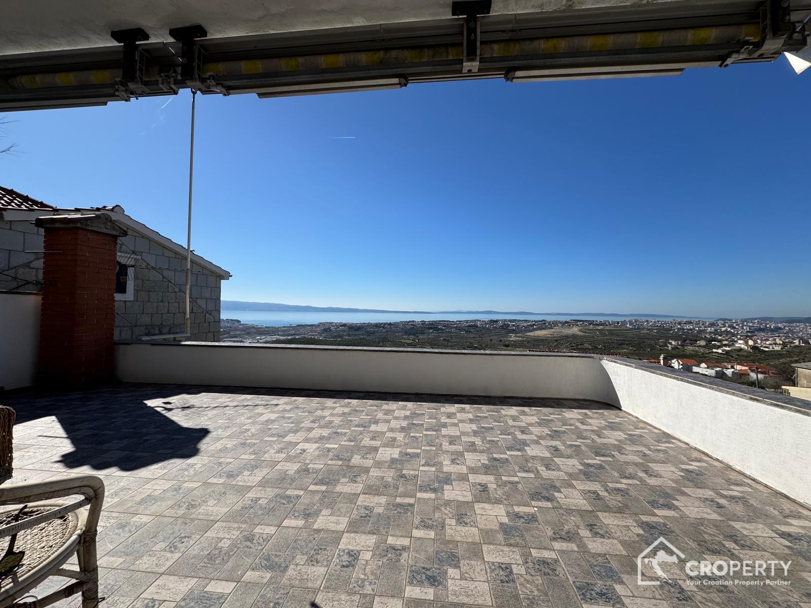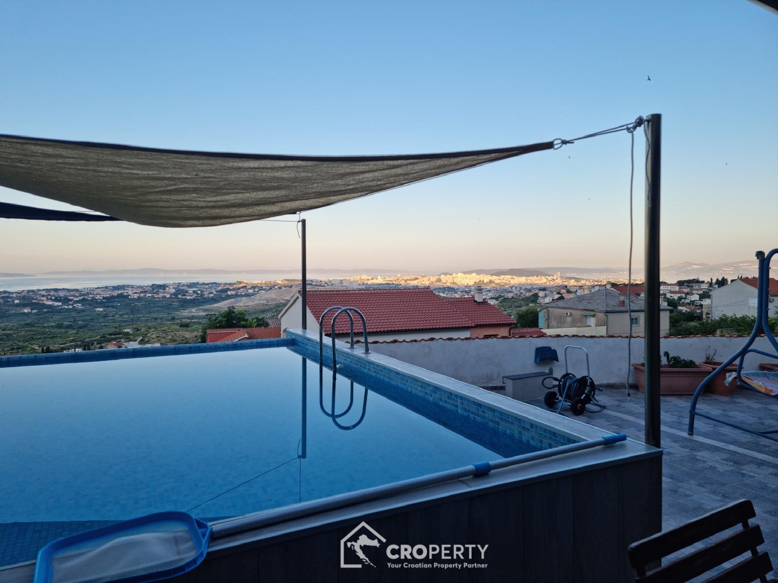 Vanjski prostor krasi prostrana terasa i bazen s lijepim pogledom na more i grad Split. Vila je izgrađena od kamena, što joj daje poseban šarm, a prostor oko bazena pruža privatnost i mir. Zbog svoje orijentacije u ovoj ljepotici možete doživjeti prekrasne zalaske sunca s pogledom na more i svjetla grada Splita.