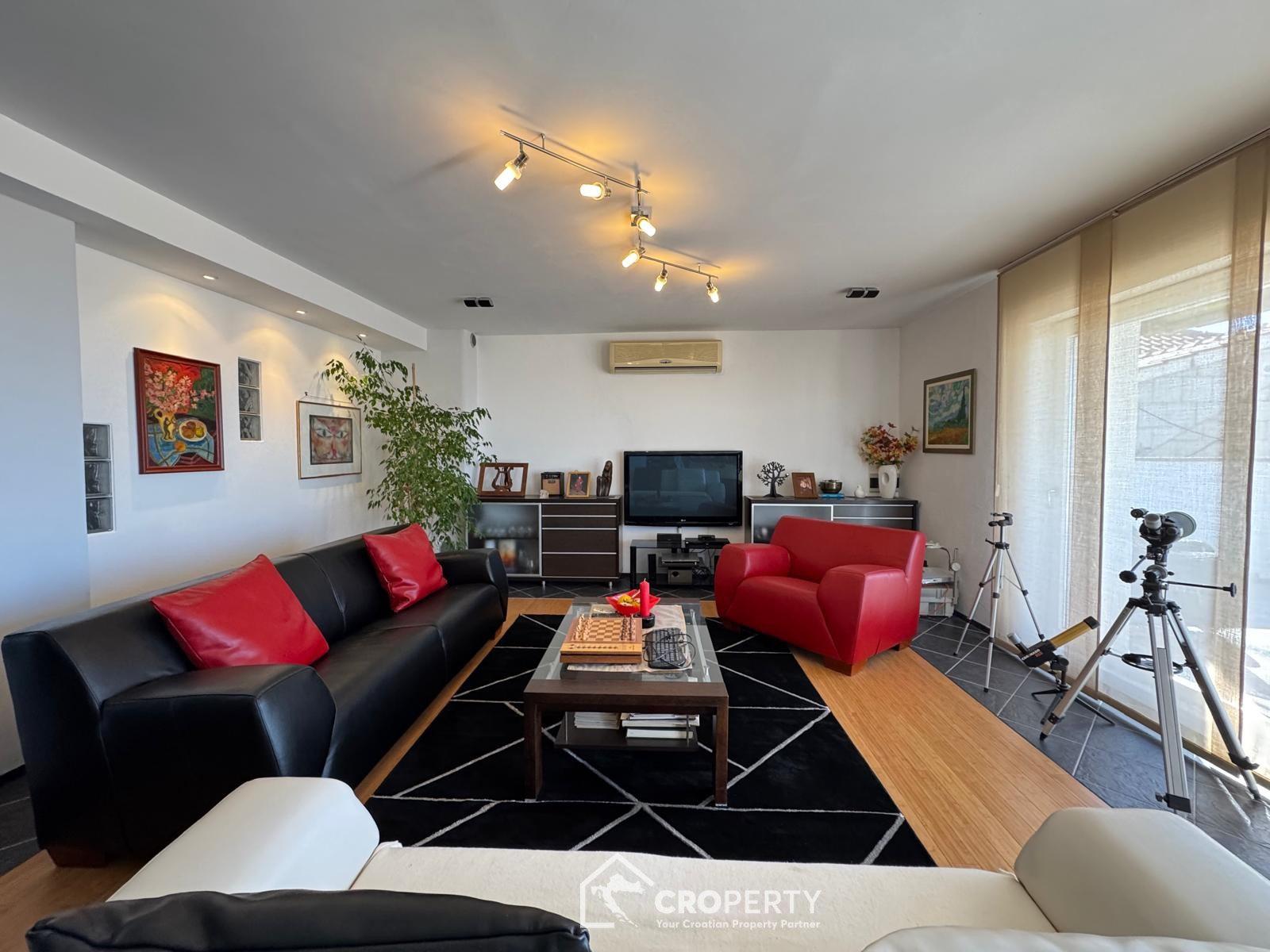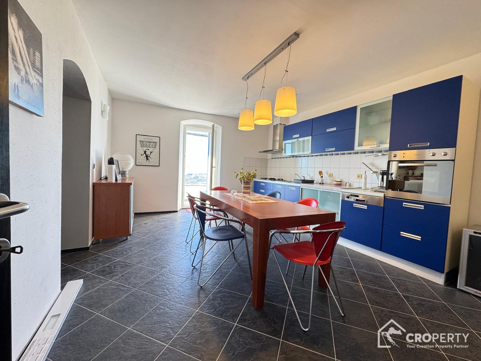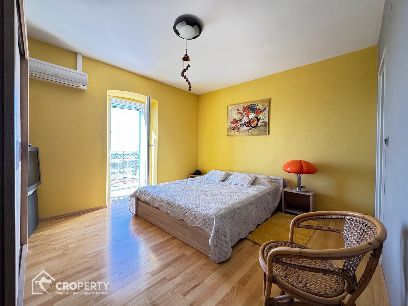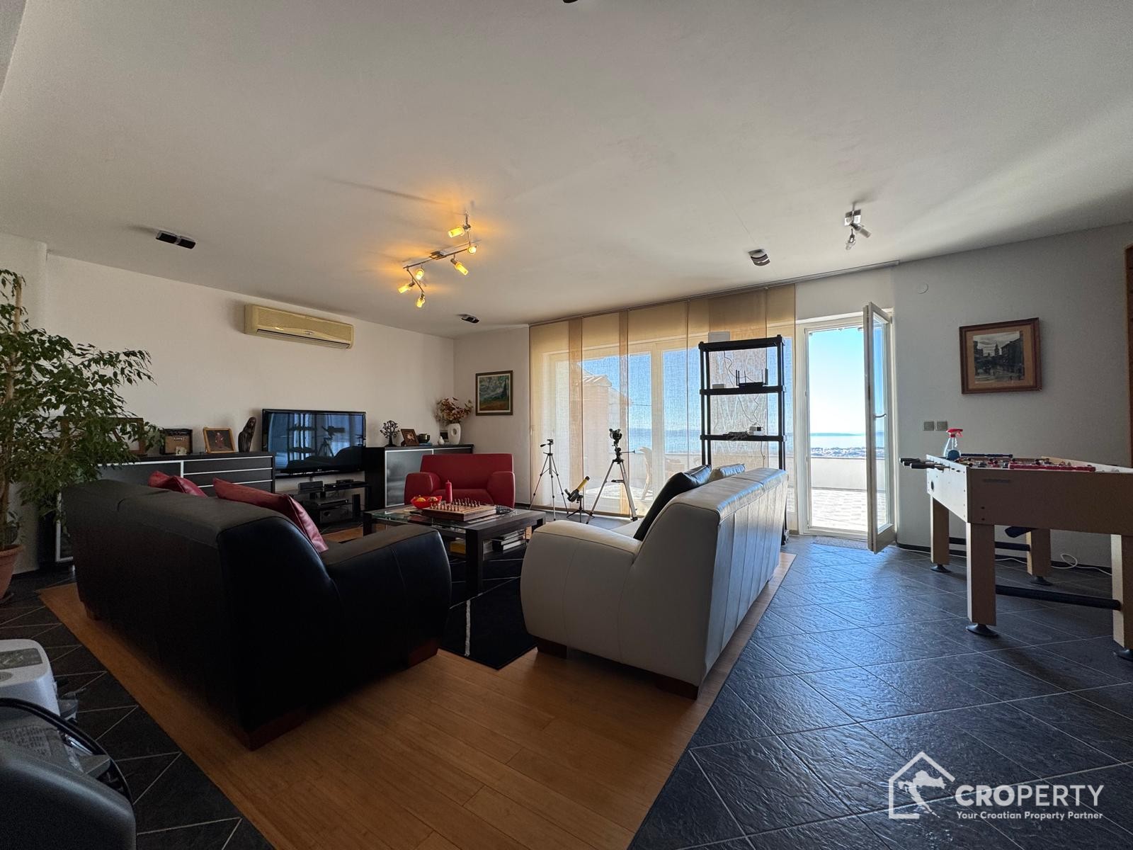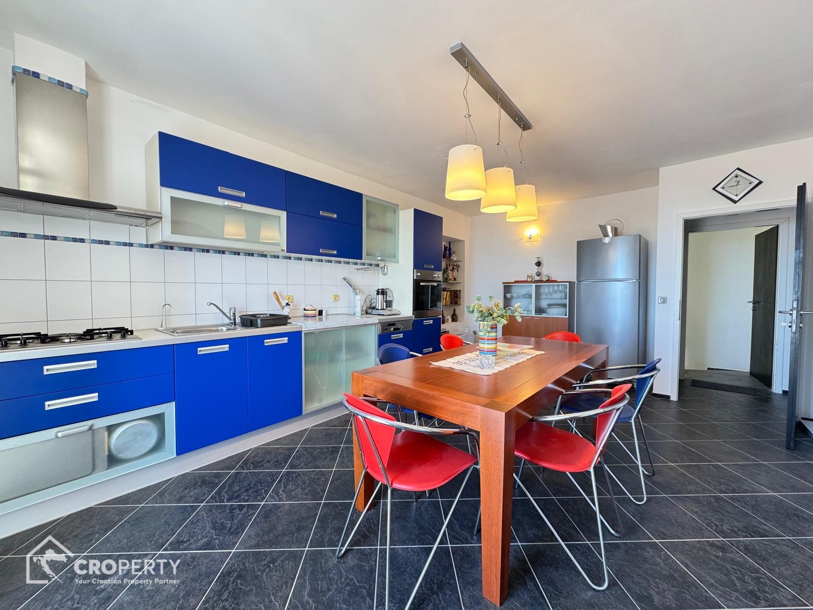 – dvoetažni stan se sastoji od dnevnog boravka 40m2 i kuhinje sa blagovaonom 25m2 koji su povezani prekrasnom terasom 35m2 s pogledom na more i grad. Tu je i kupatilo sa wc-om i unutarnje stepenice koje vode na drugi kat.