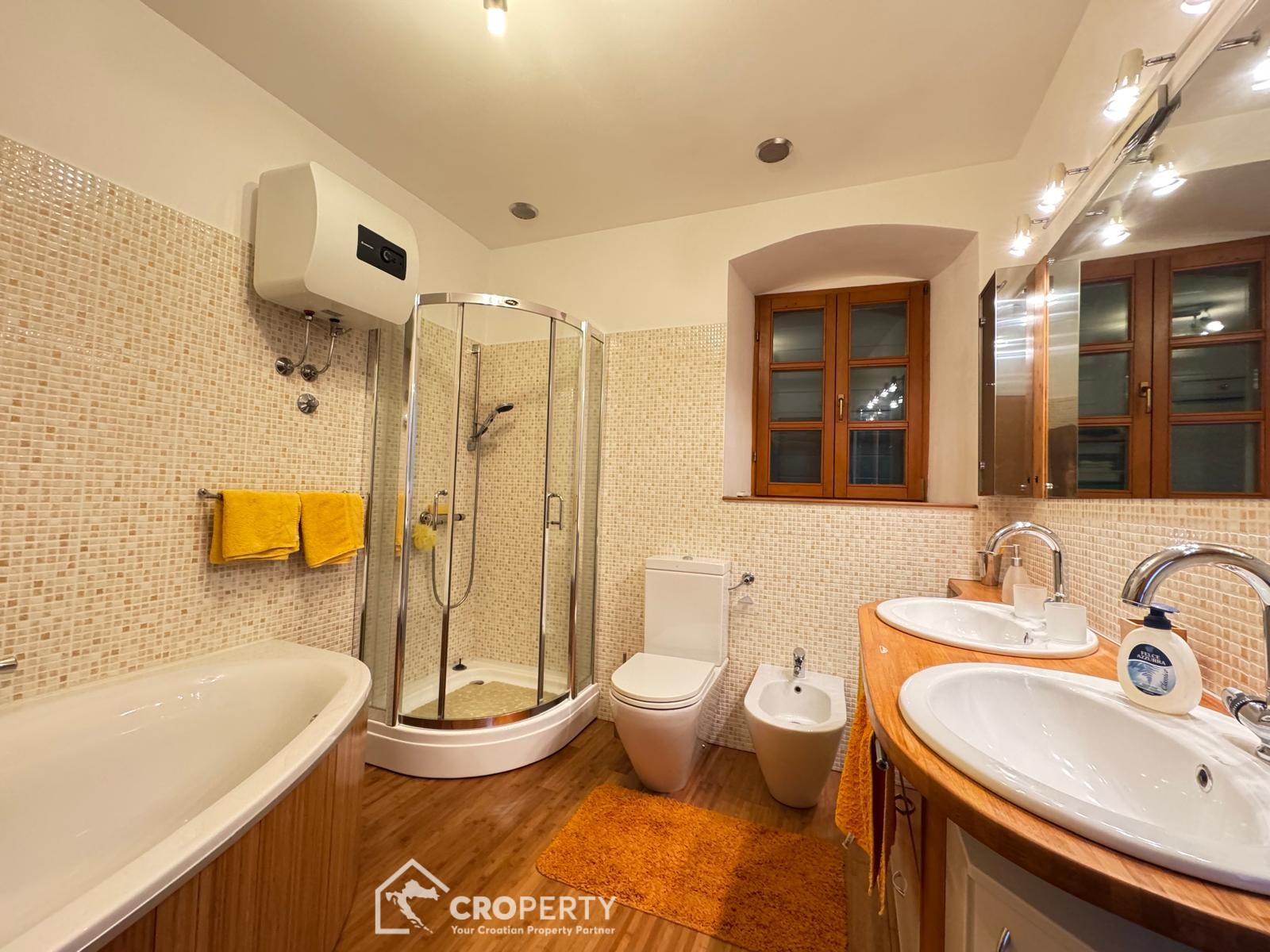 Vila je kompletno renovirana i opremljena kvalitetnim namještajem, uključujući klima uređaje, internet i satelitsku televiziju. Iza vile se nalazi vrt i privatni parking sa 3-5 mjesta.
