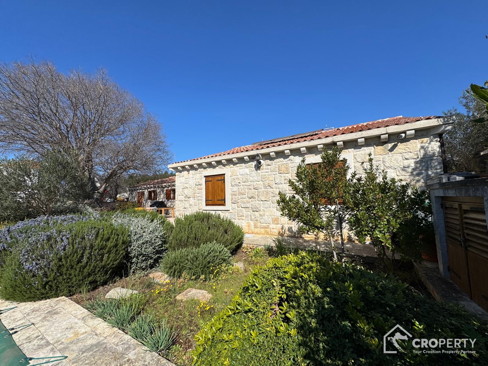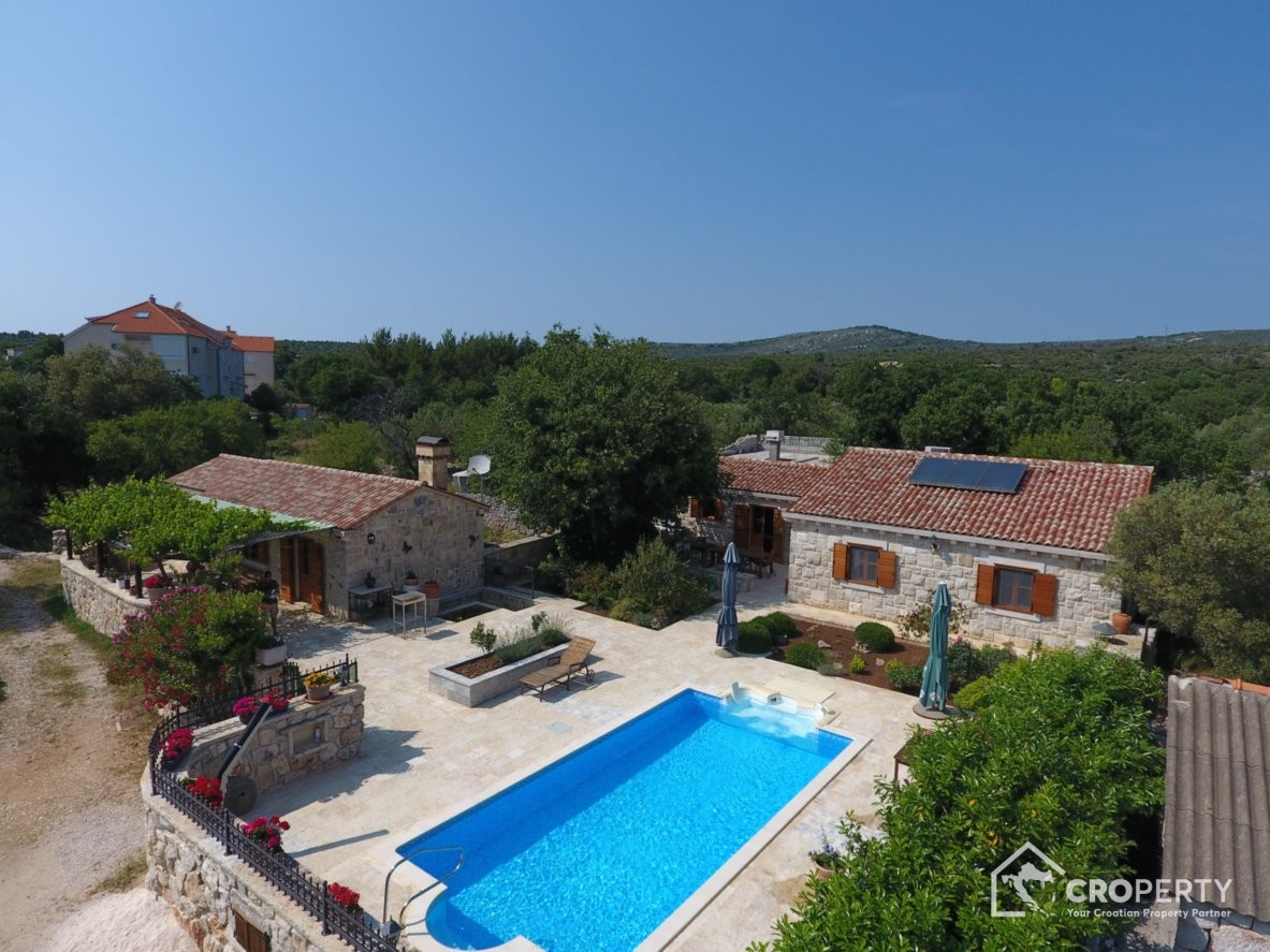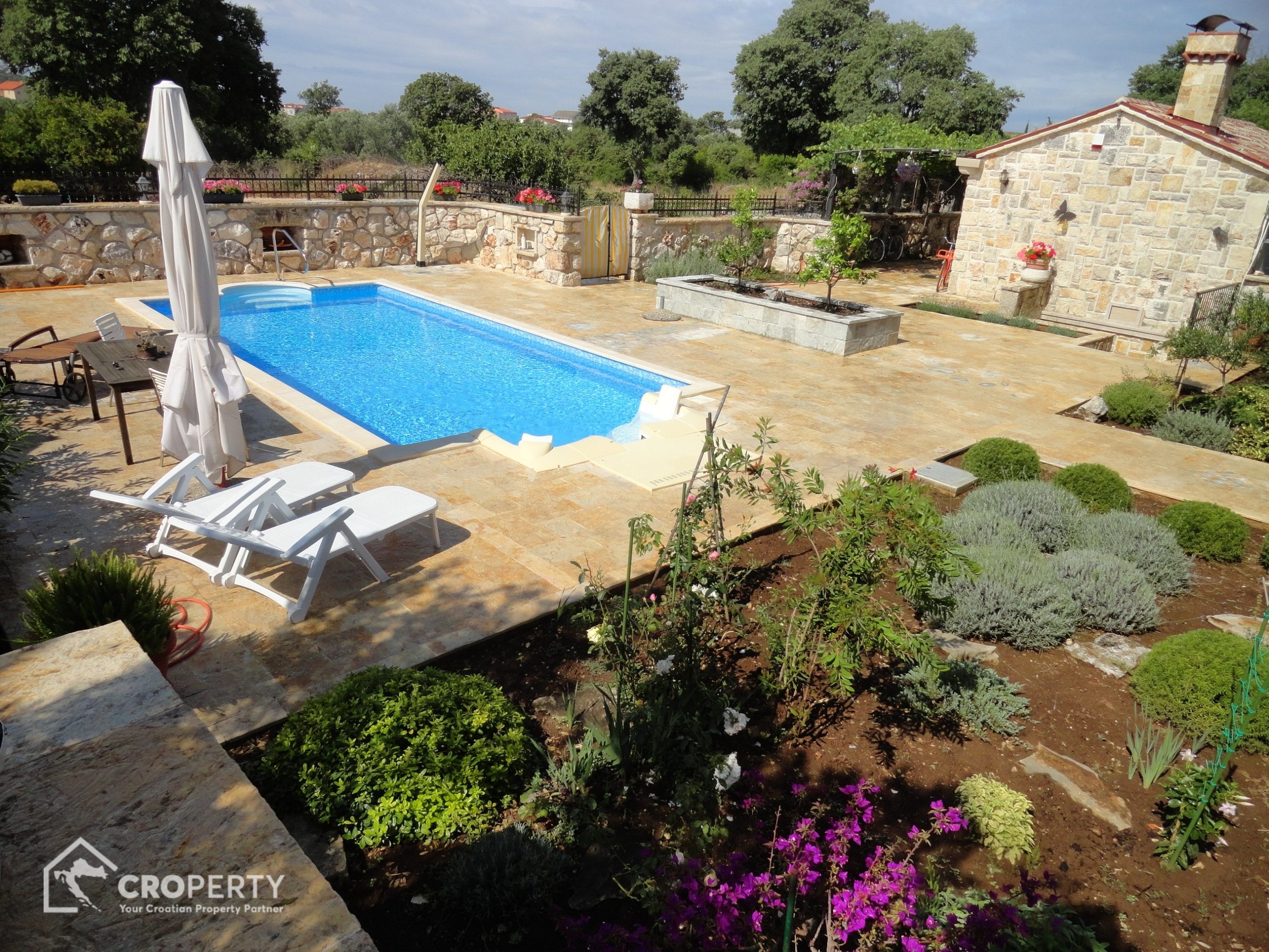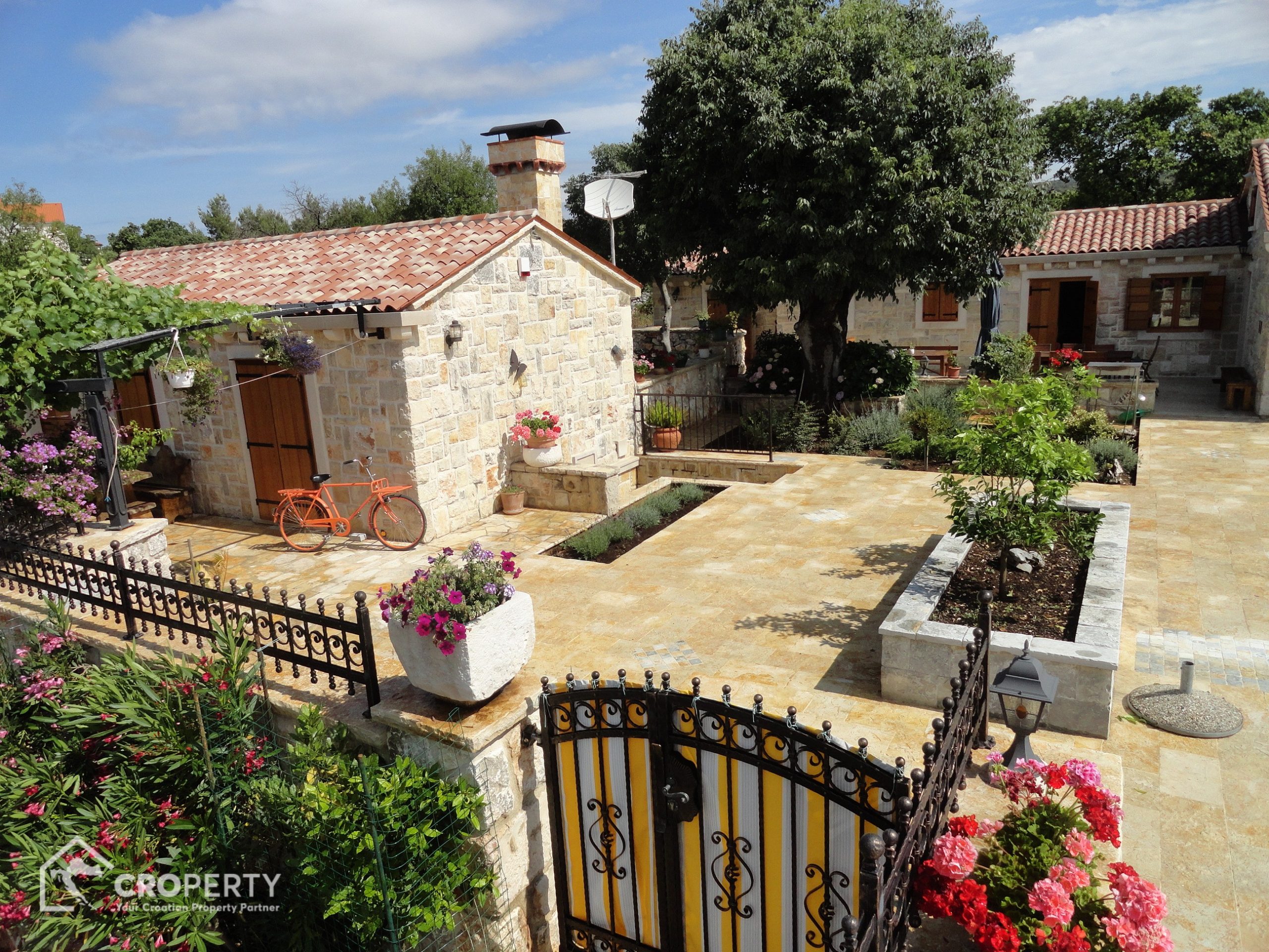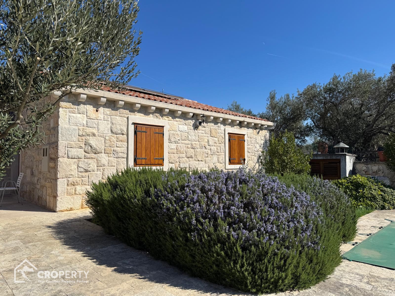 Nudimo vam jedinstvenu priliku za kupnju luksuzne vile izgrađene 2012. godine u autentičnom dalmatinskom stilu, izrađene od pravog ručno klesanog kamena. Vilu karakteriziraju vrhunski izolirani zidovi debljine 60 cm, zahvaljujući termo-fasadi koja osigurava minimalne troškove grijanja i hlađenja. U elegantno uređenom dvorištu, popločanom prirodnim kamenom i ukrašenom primorskim biljem, nalazi se grijani bazen za opuštanje tijekom cijelog dana, čak i za vrućih ljetnih mjeseci.