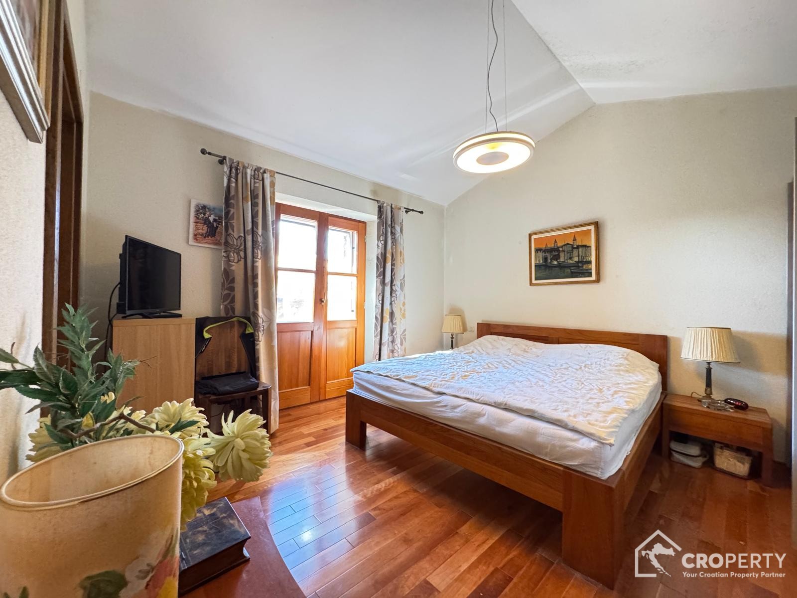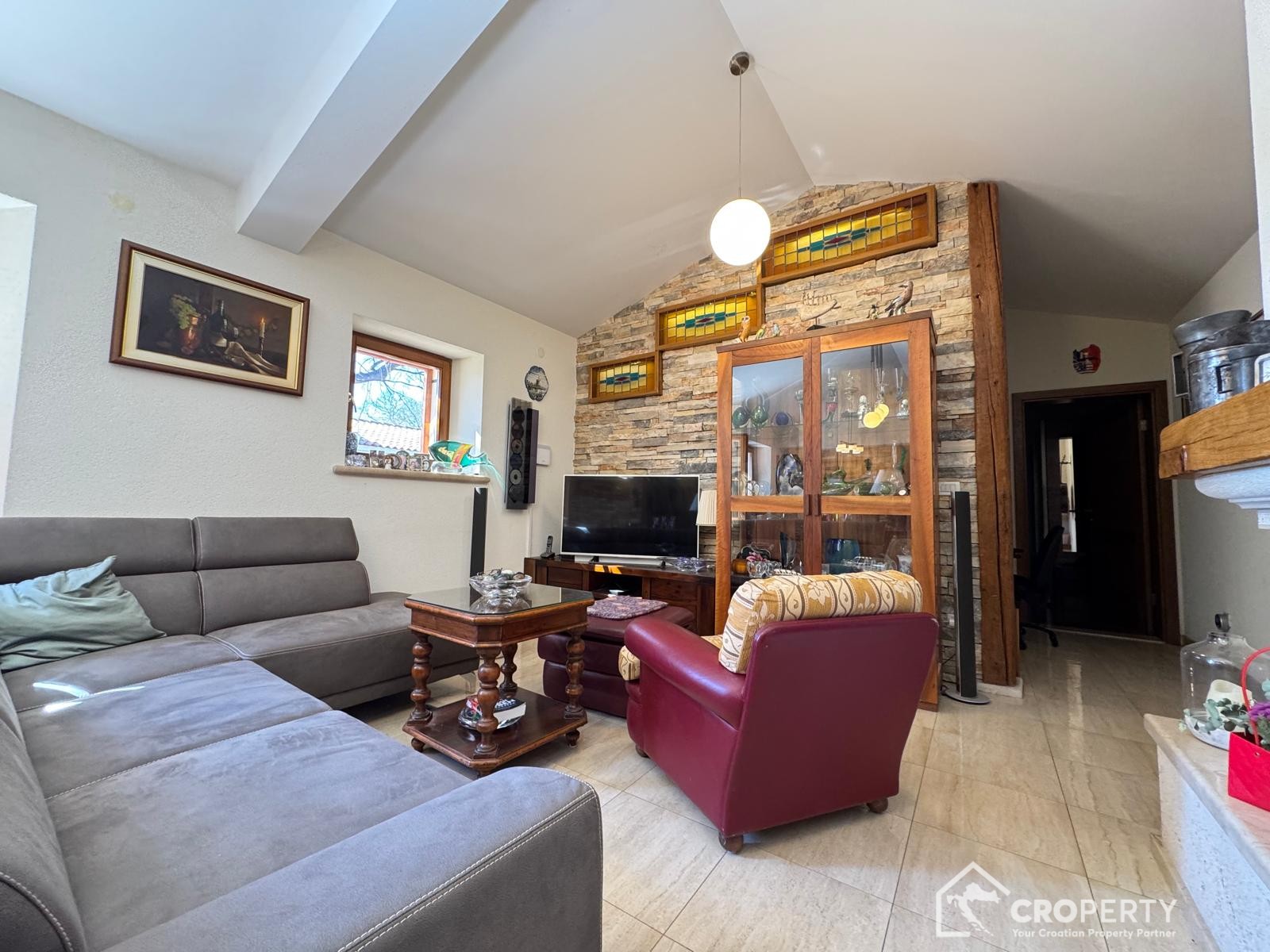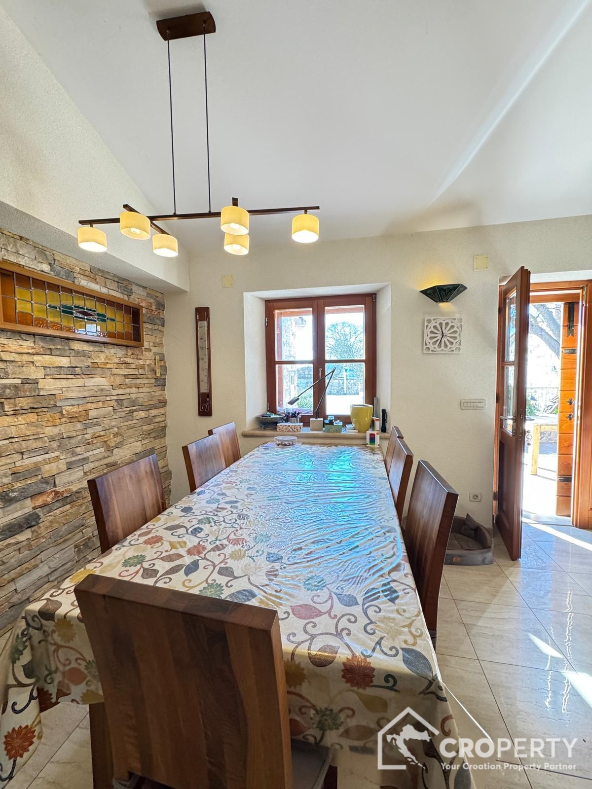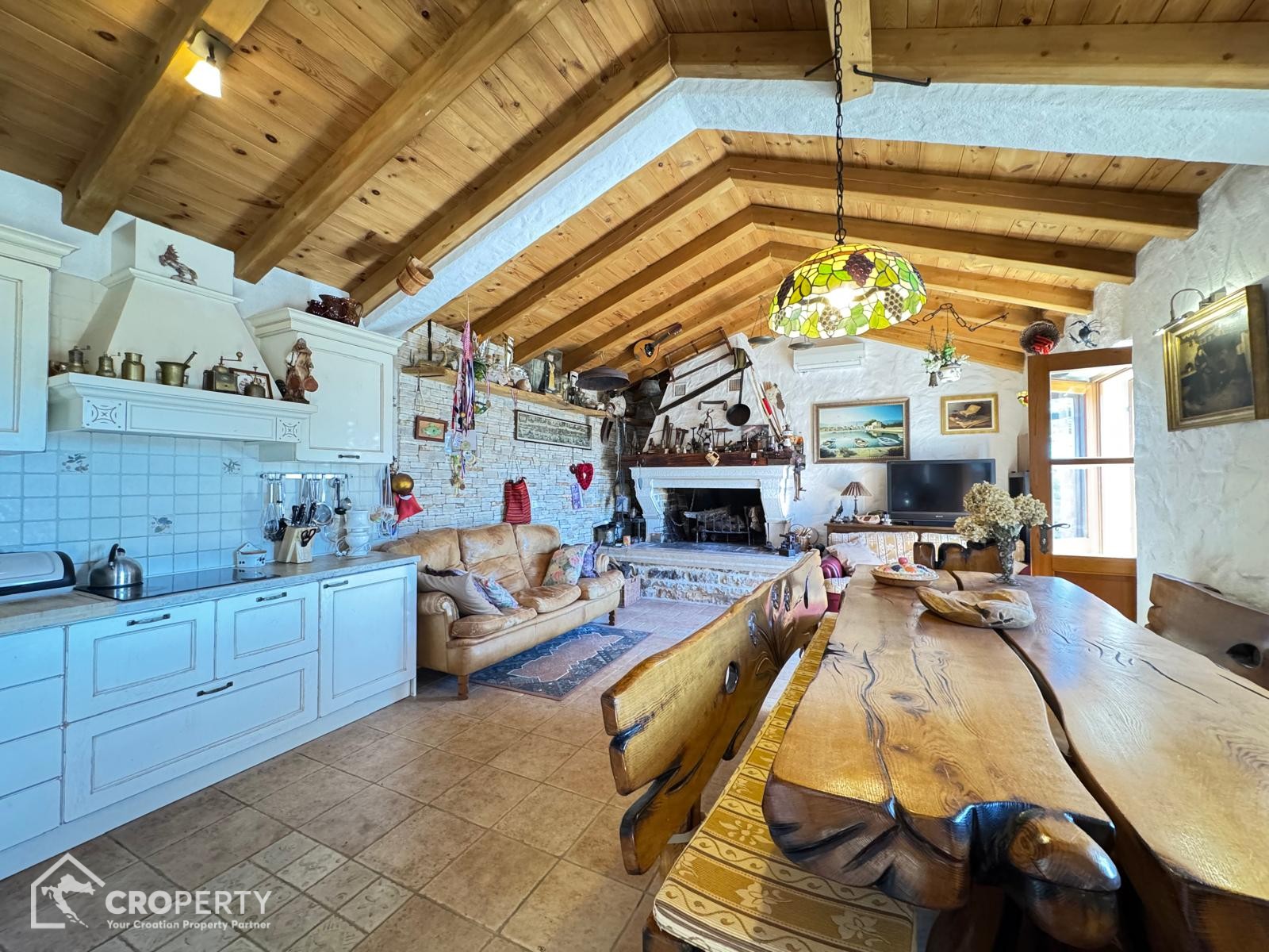 Glavni objekt obuhvaća bruto površinu od 200 m2. Unutar prostranog i moderno uređenog interijera nalaze se elegantan dnevni boravak povezan s blagovaonicom i kuhinjom, tri stilski uređene spavaće sobe, dva suvremena kupatila te funkcionalno potkrovlje. Kao dodatak, posebna pažnja posvećena je udobnosti uz podno grijanje i luksuzni ‘montegrappa’ kamin. Namještaj je izrađen od punog orahovog drveta, dok su prostori oplemenjeni parketom od trešnje i prozorima od ariša. Cijeli objekt je klimatiziran.