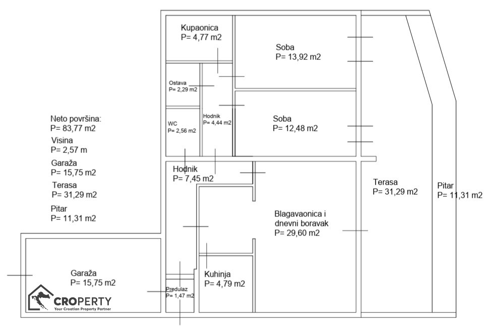 stan 83,77m2 +terasa 31,29 m2 +vrt 11,31 m2 = 126,37m2 + garaža 15,75m2 (vidi tlocrt).