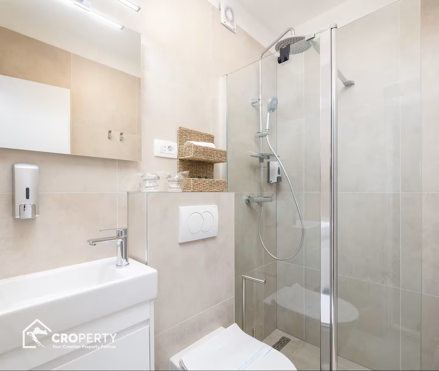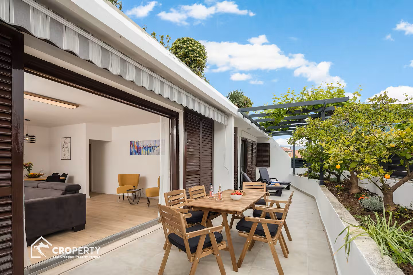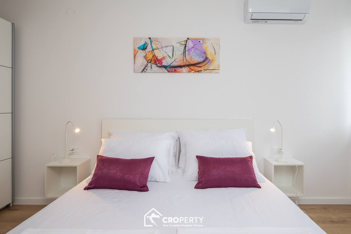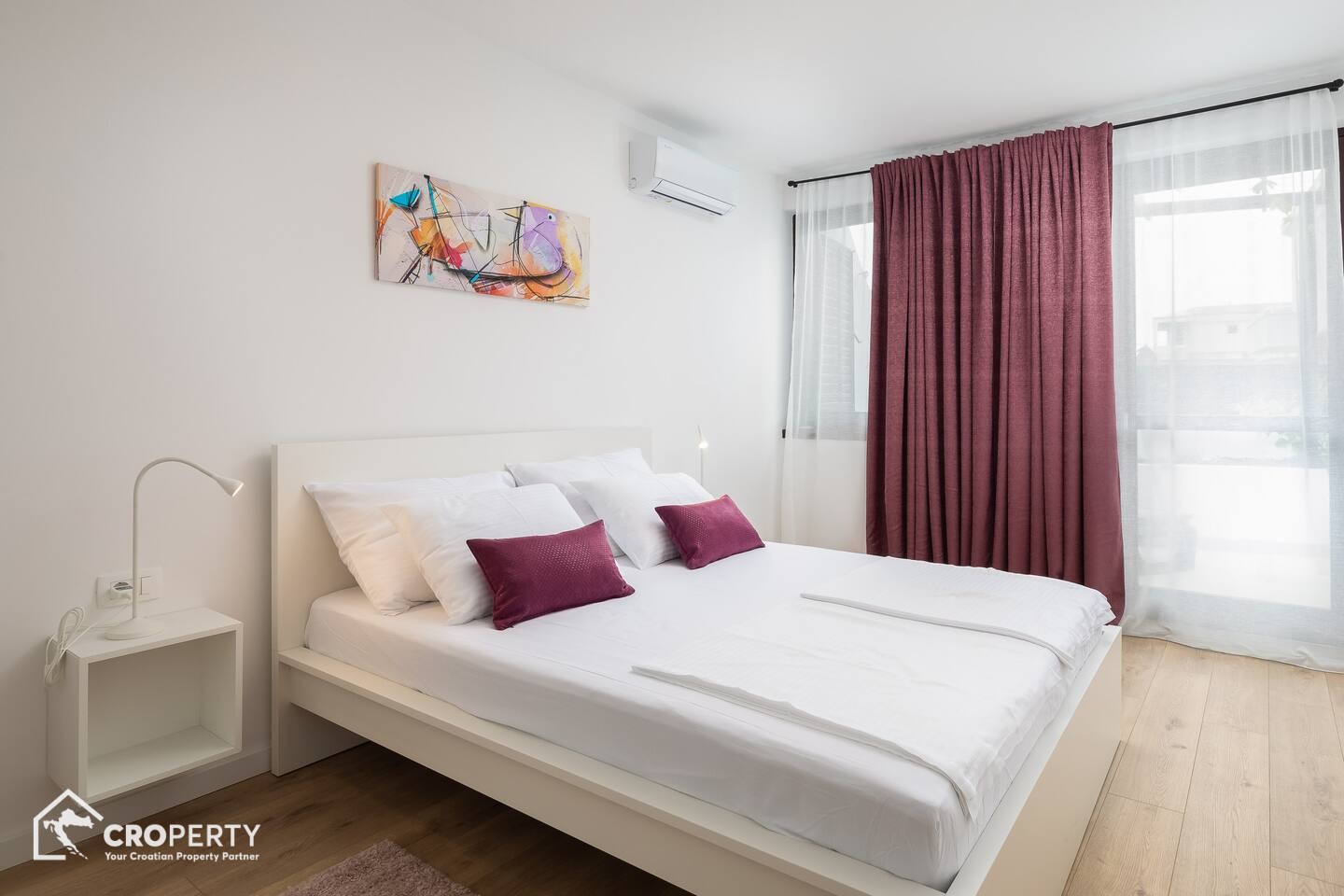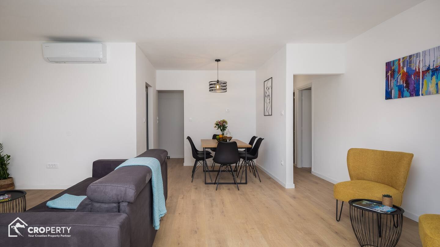 Južne je orijentacije, obiluje prirodnim svjetlom i ima iznimno funkcionalan raspored. Spavaći dio s dvije komforne sobe i dva moderno uređena kupatila odvojen je od dnevnog dijela koji se sastoji od prostranog dnevnog boravka, blagovaonice i kuhinje. Iz dnevnog dijela izlazi se na veliku terasu s prekrasnim pogledom na more – idealno mjesto za uživanje i odmor.