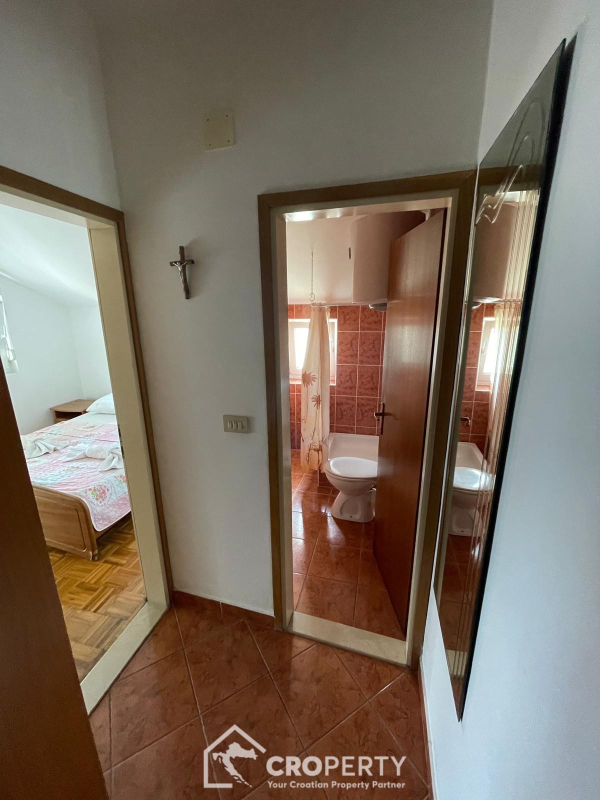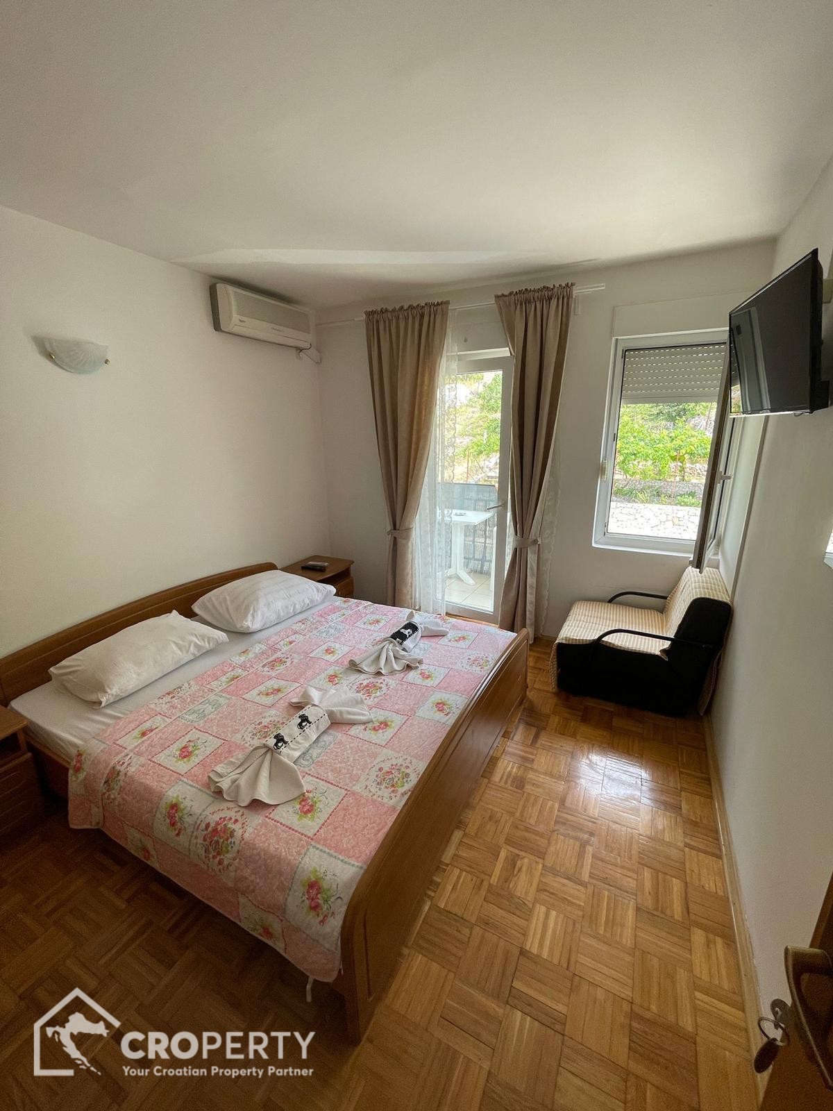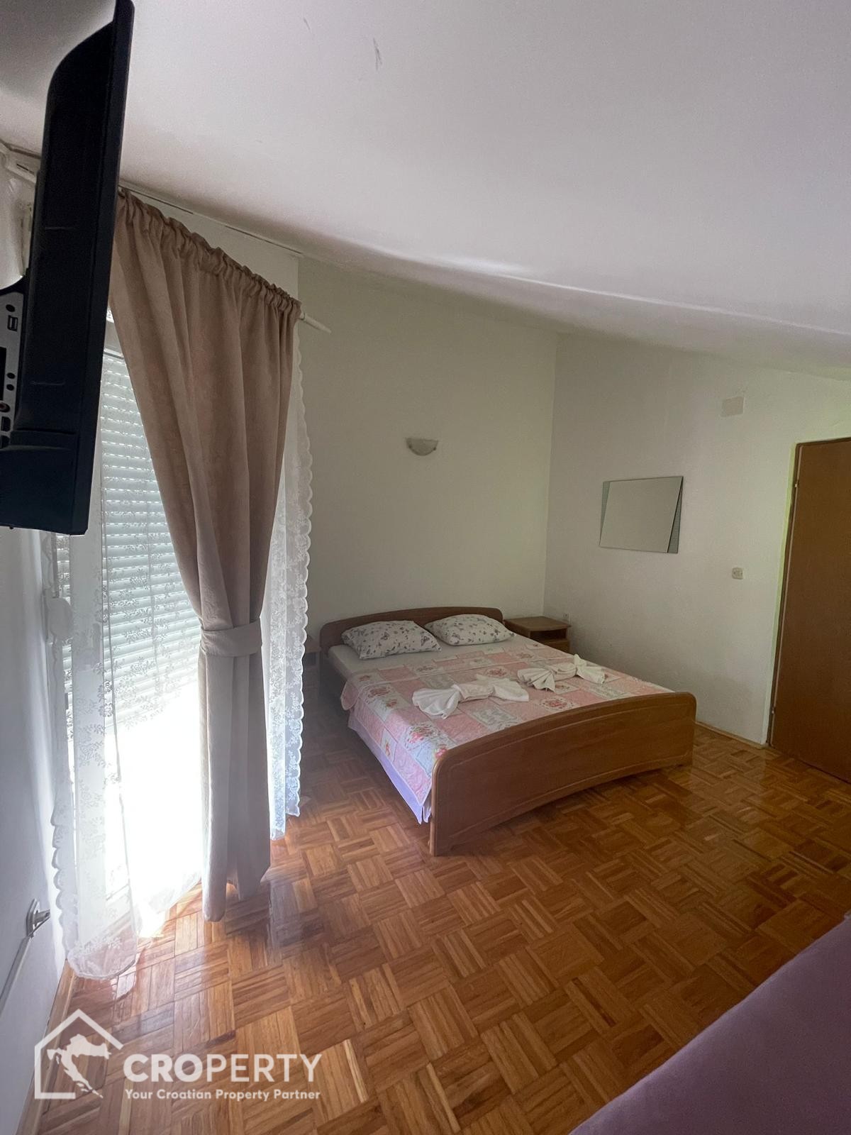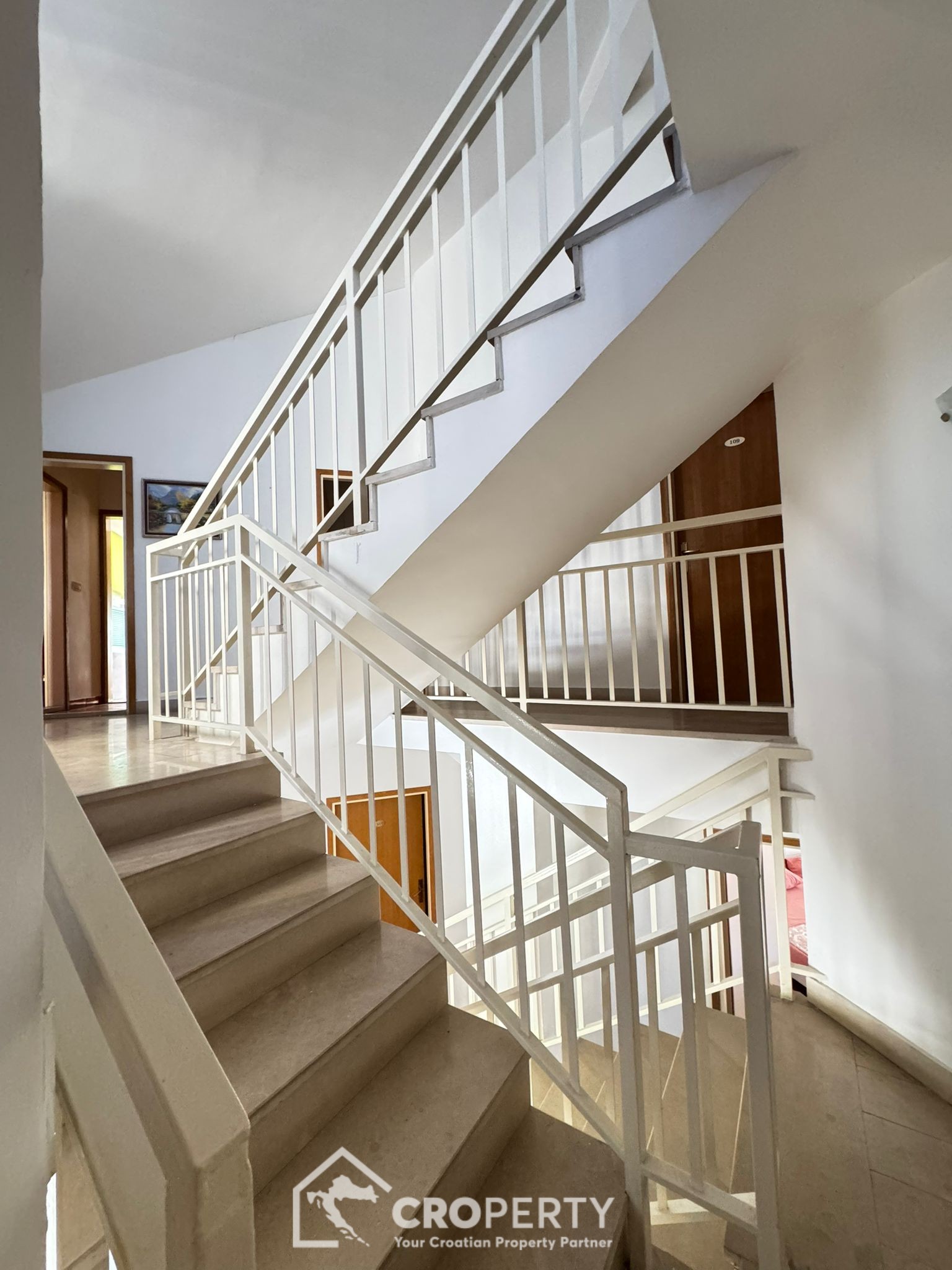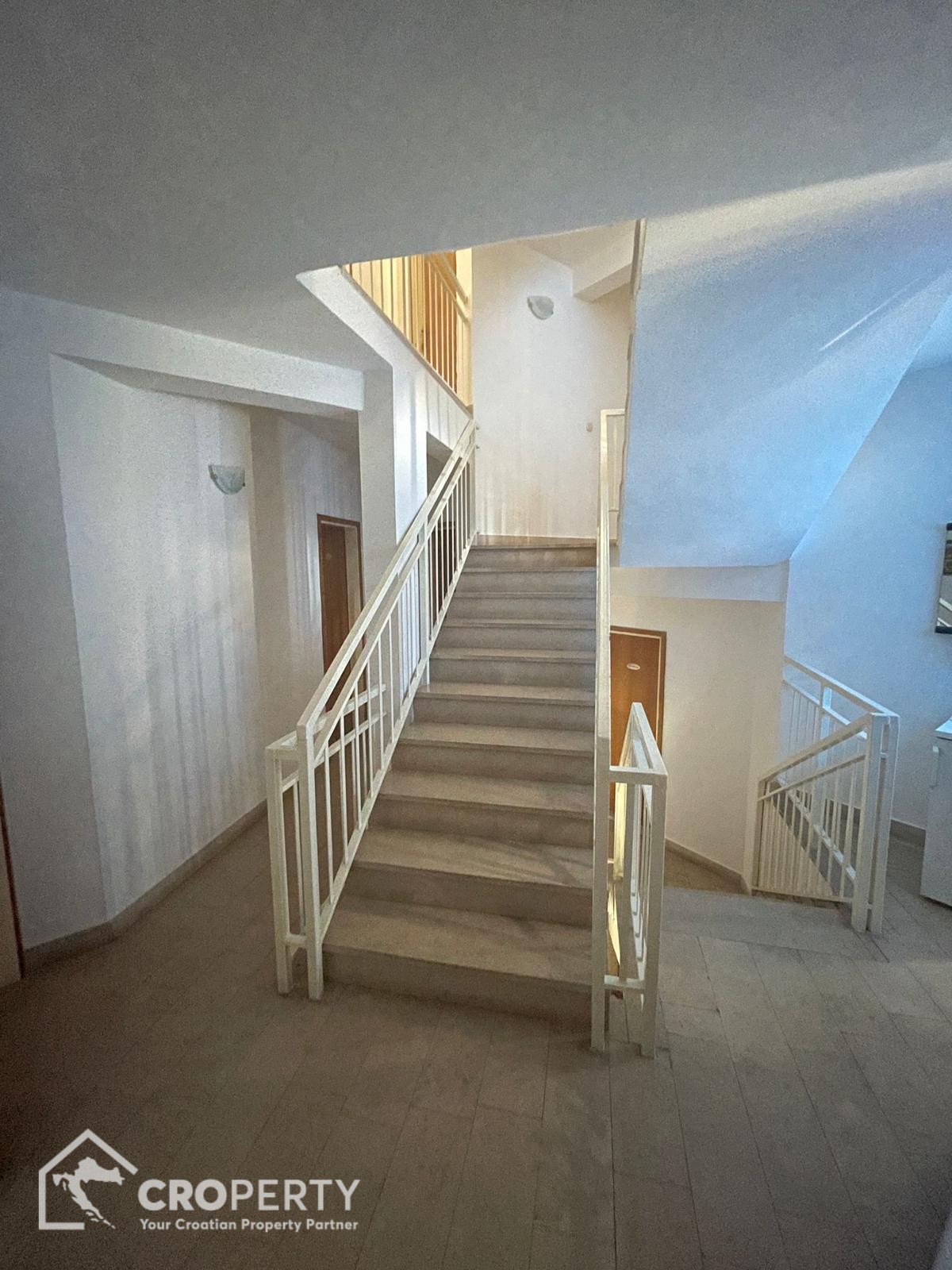 Na višim etažama raspoređene su prostrane spavaće sobe – svaka s vlastitim kupatilom i klimatizacijom – što ovu nekretninu čini idealnim izborom za turistički najam. Nakon recepcije, slijede četiri sobe na prvom katu, još četiri na drugom te dodatne dvije sobe na međukatovima, koje pružaju kapacitet i udobnost za veći broj gostiju.