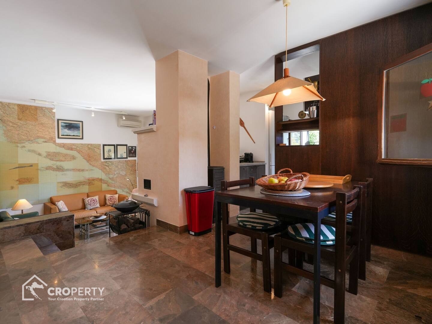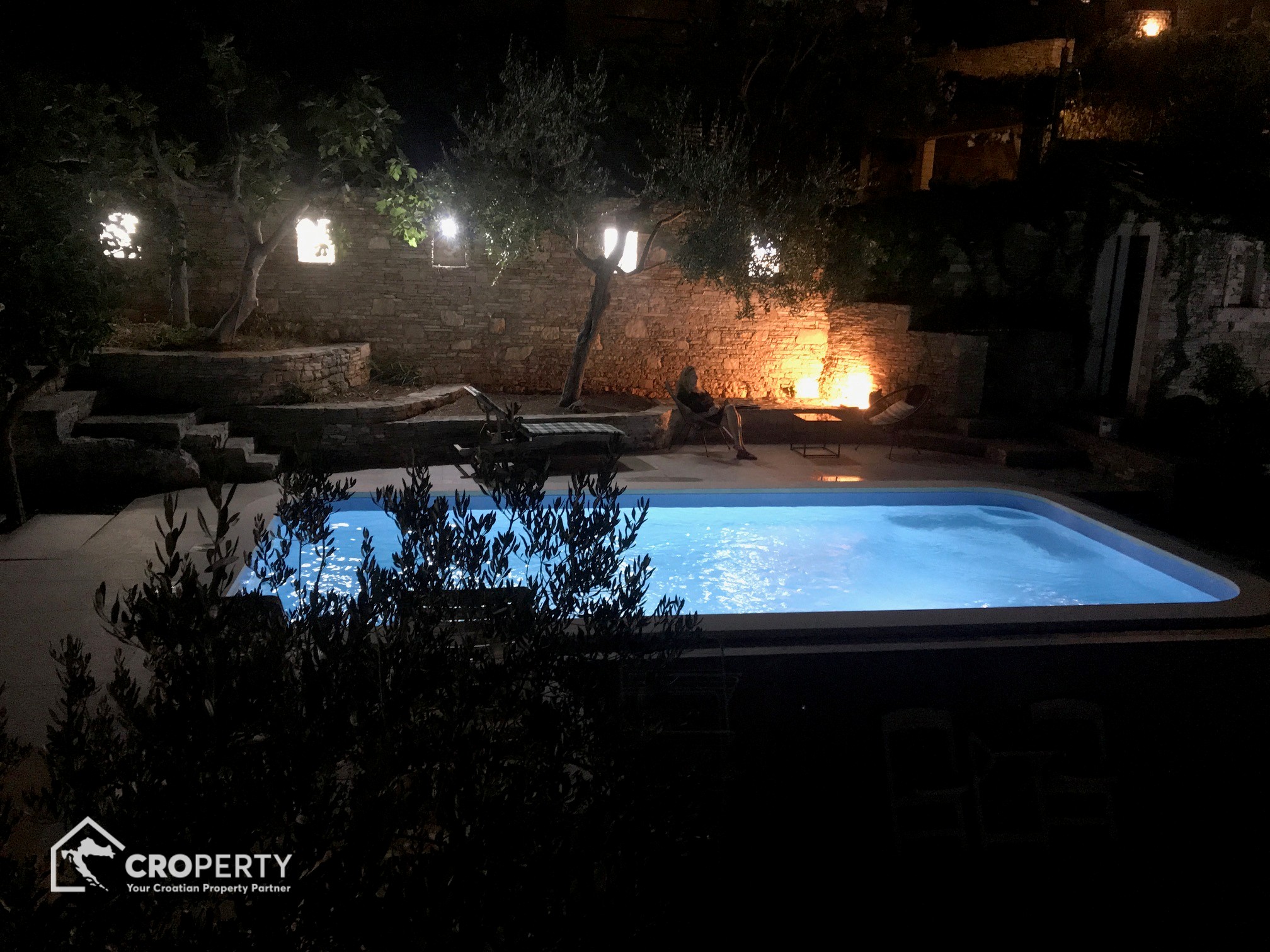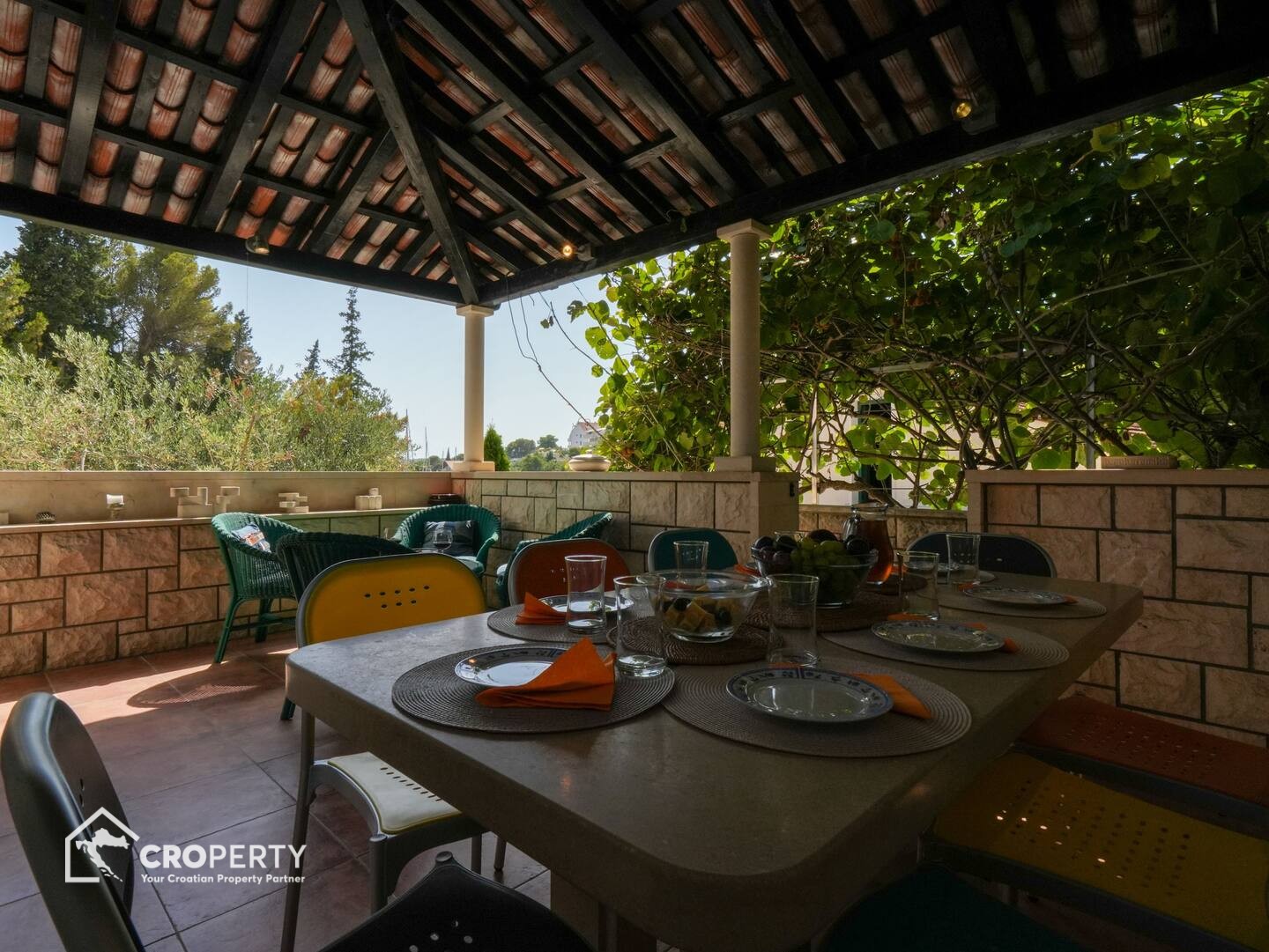 Uz kuću je povezana natkrivena terasa površine 20 m2 na razini prizemlja opremljena originalno dizajniranim kamenim stolom za blagovanje (10 osoba). Uz nju, nekoliko stepenica niže, vezuje se veća otvorena terasa s još većim originalno dizajniranim kamenim stolom za blagovanje (14 osoba), uz koju postoji zidani roštilj s „ljetnom kuhinjom“. Na razini niskog prizemlja je natkrivena terasa s roštiljem, površine cca 8 m2. Na prvom podu je mala terasa s prekrasnim pogledom na uvalu.