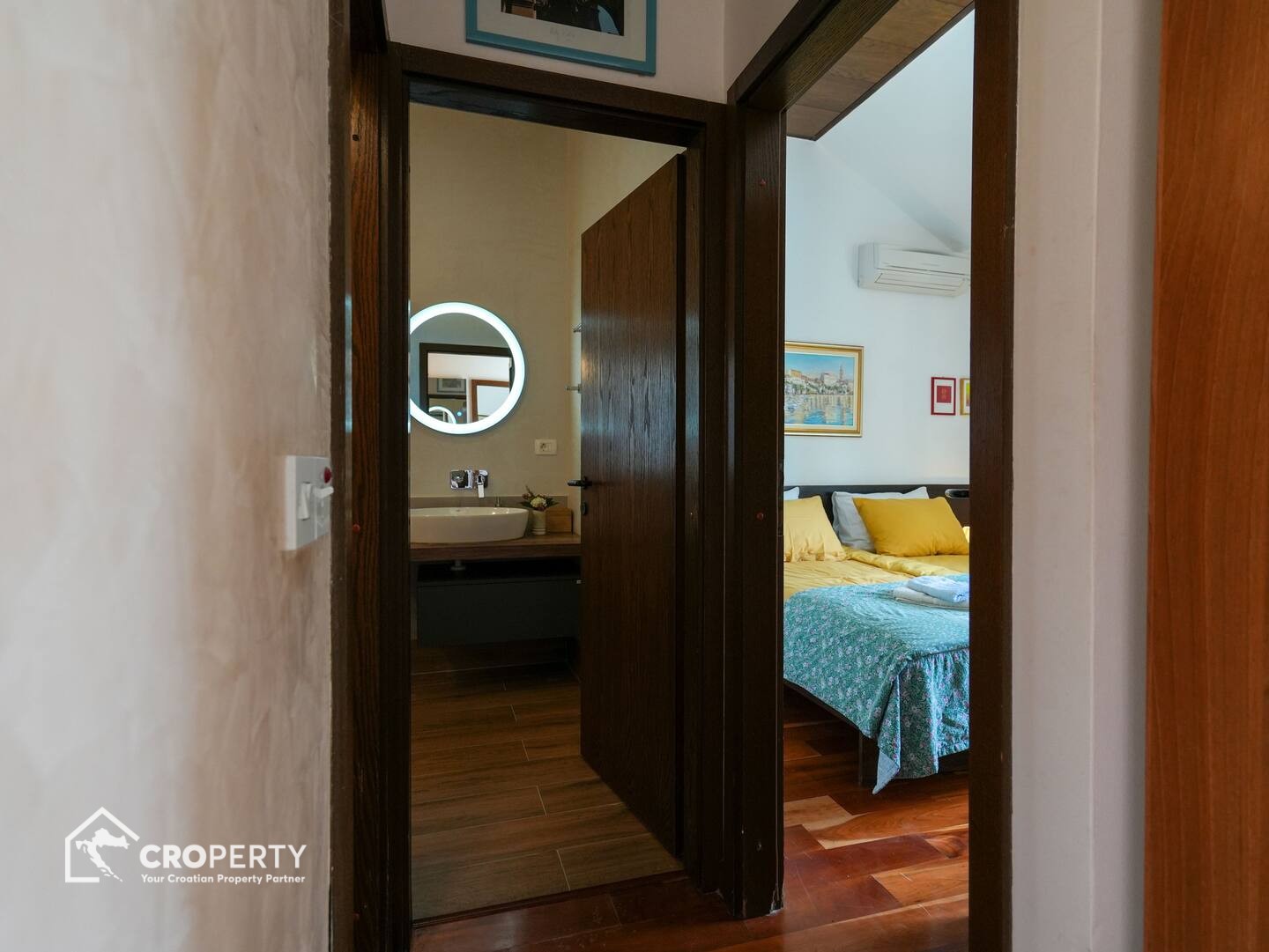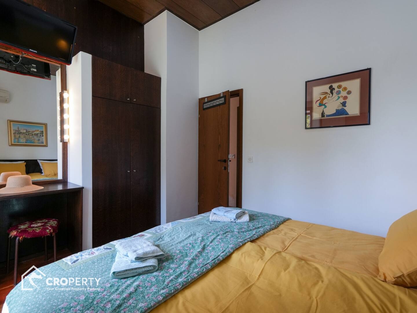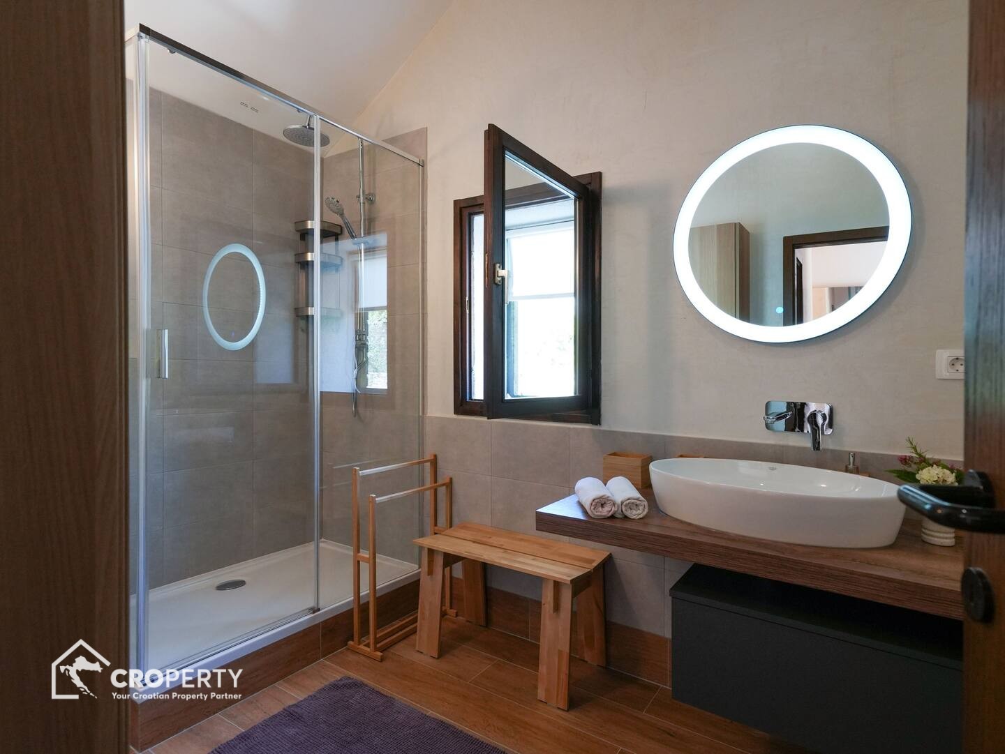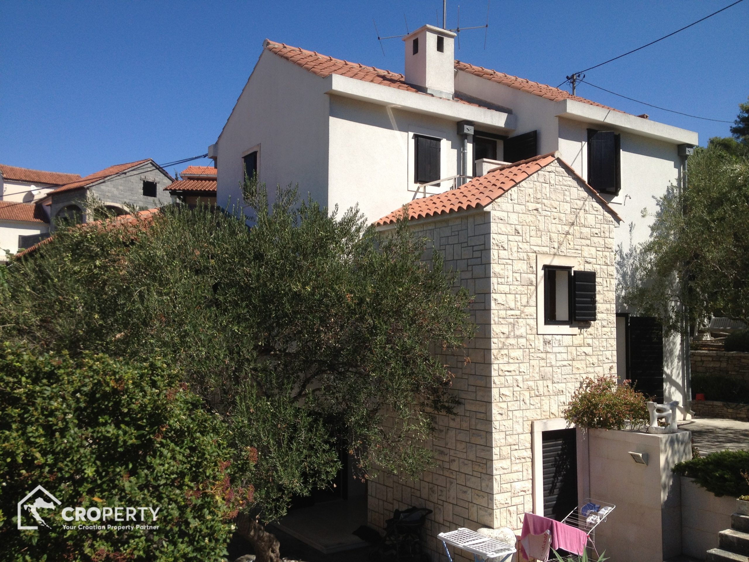 Uz kuću je povezana natkrivena terasa površine 20 m2 na razini prizemlja opremljena originalno dizajniranim kamenim stolom za blagovanje (10 osoba). Uz nju, nekoliko stepenica niže, vezuje se veća otvorena terasa s još većim originalno dizajniranim kamenim stolom za blagovanje (14 osoba), uz koju postoji zidani roštilj s „ljetnom kuhinjom“. Na razini niskog prizemlja je natkrivena terasa s roštiljem, površine cca 8 m2. Na prvom podu je mala terasa s prekrasnim pogledom na uvalu.