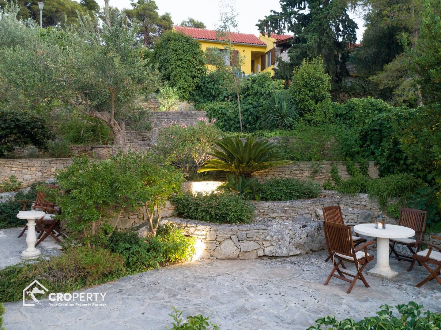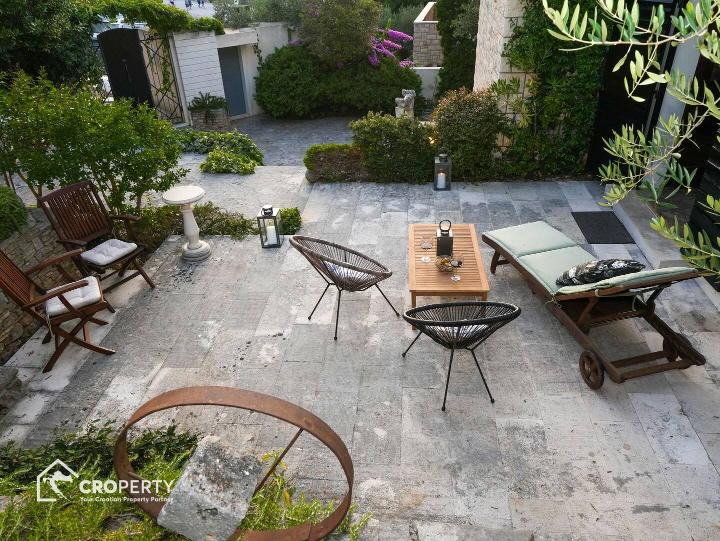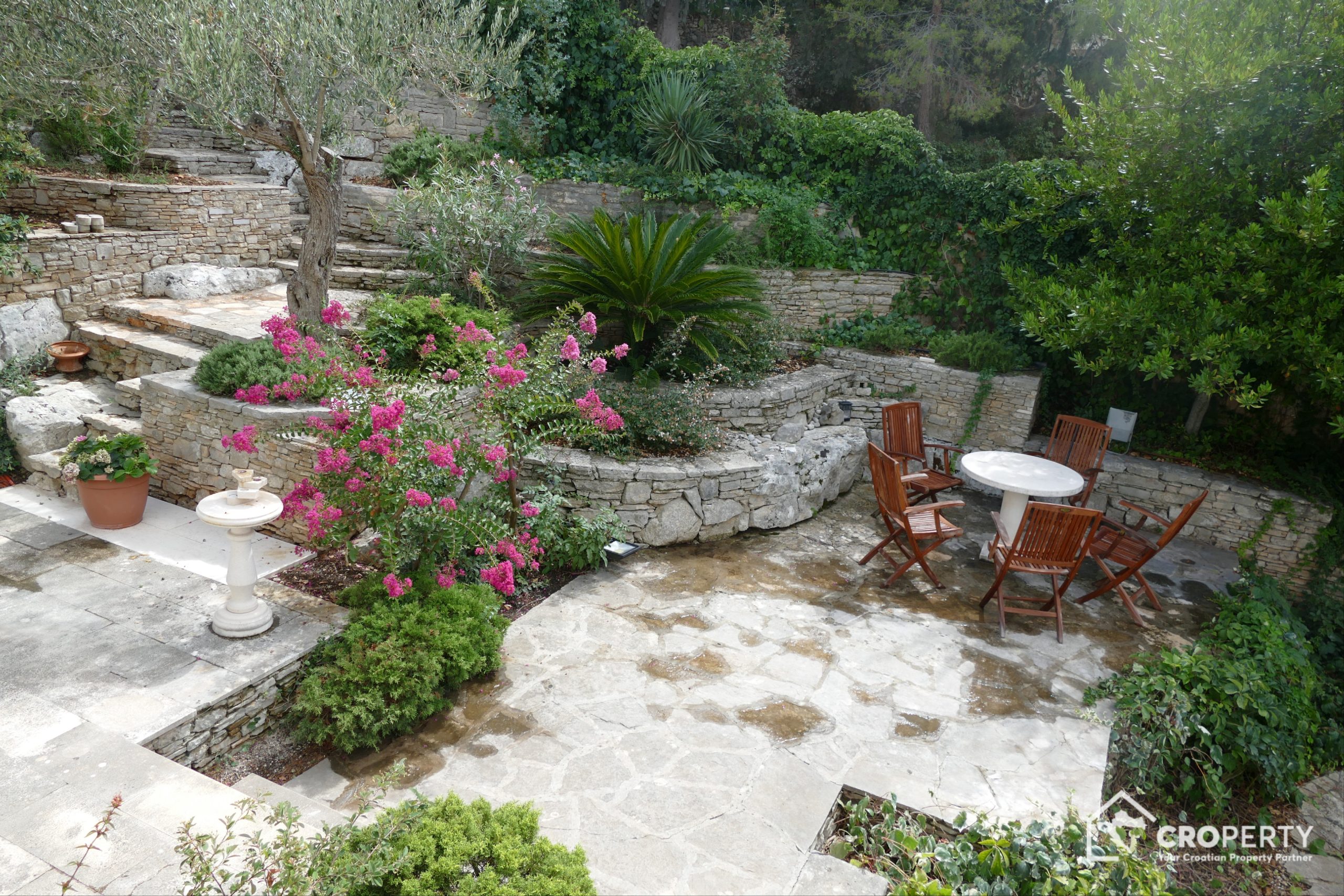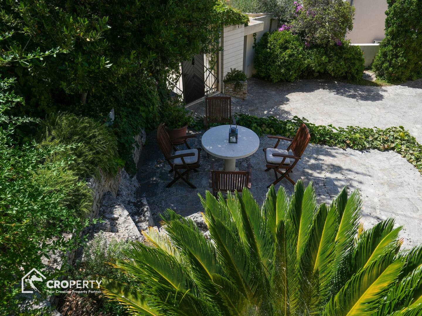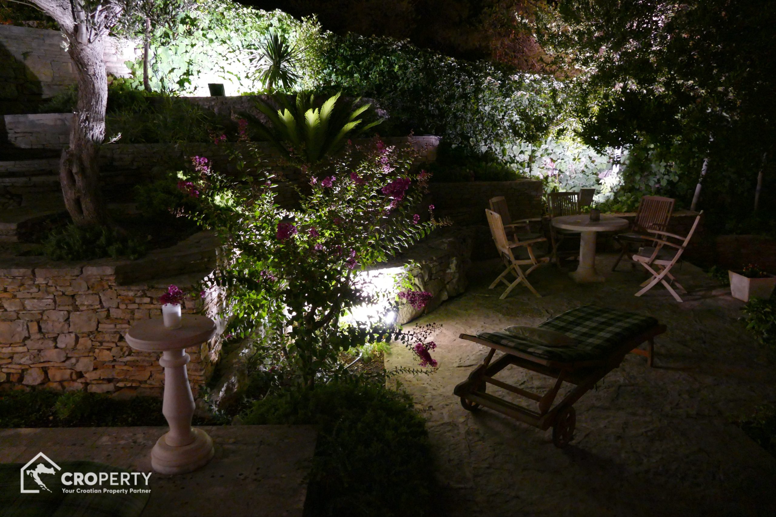 Vanjski prostor je visokim ogradama u kombinaciji zidova i zelenila zaštićen od vanjskog pogleda. Kaskadno je uređen s likovno pomno sazidanim kamenim zidovima na temu uredne suho-zidne gradnje i s kamenim podovima te hortikulturno uređenim vrtom. Uz to u vrtnom djelu postoji pet stabala maslina, te po jedna voćka limuna mjesečara, naranče, grejpa, kunkvaja, smokve, planike i tri stabljike kivija. Glavni ulaz (postoji i pomoćni) natkriven je divljom i pitomom lozom bijelog grožđa.