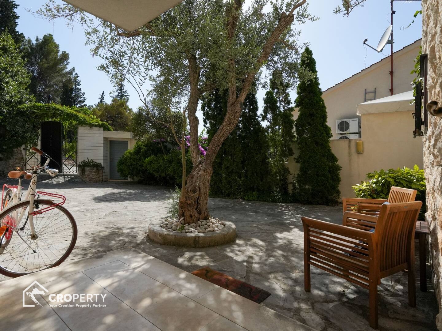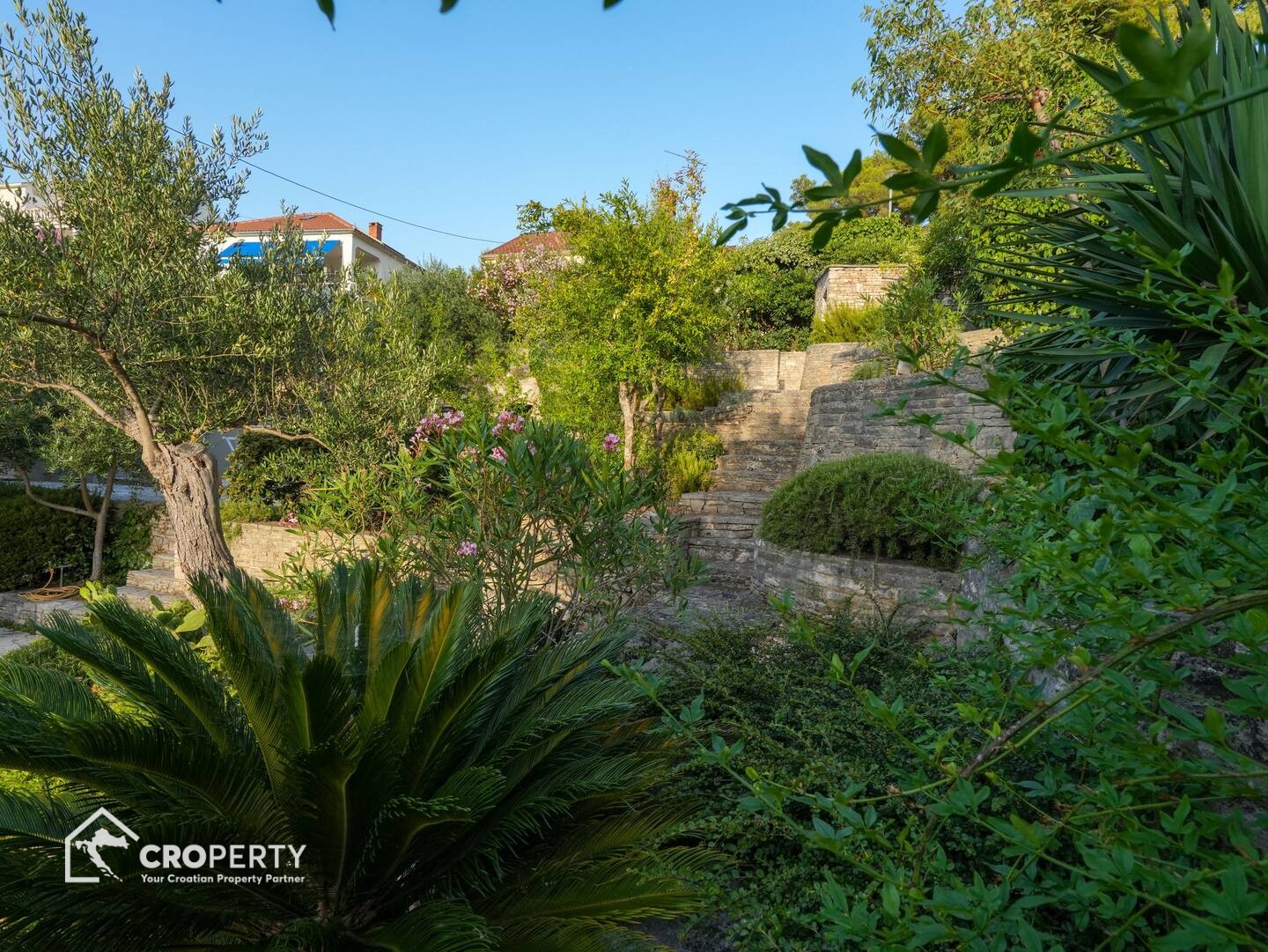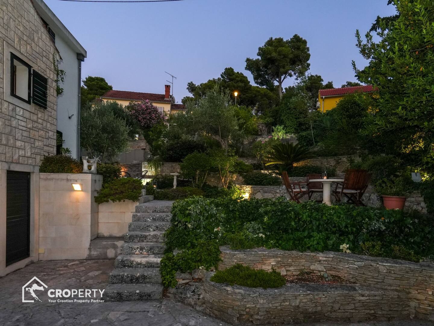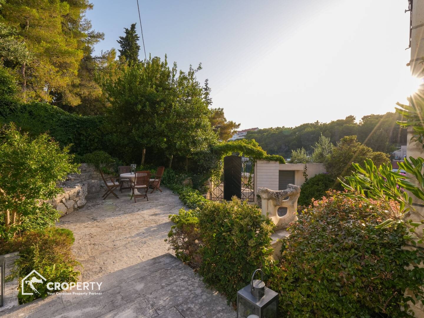 Vanjski prostor je visokim ogradama u kombinaciji zidova i zelenila zaštićen od vanjskog pogleda. Kaskadno je uređen s likovno pomno sazidanim kamenim zidovima na temu uredne suho-zidne gradnje i s kamenim podovima te hortikulturno uređenim vrtom. Uz to u vrtnom djelu postoji pet stabala maslina, te po jedna voćka limuna mjesečara, naranče, grejpa, kunkvaja, smokve, planike i tri stabljike kivija. Glavni ulaz (postoji i pomoćni) natkriven je divljom i pitomom lozom bijelog grožđa.