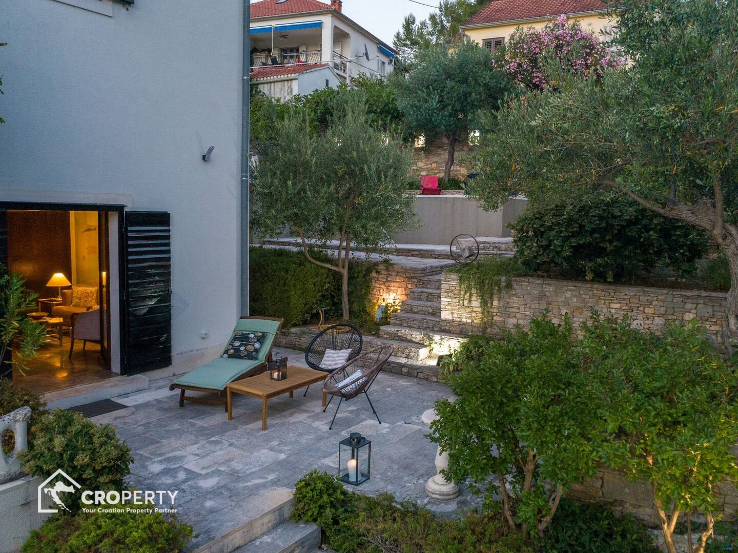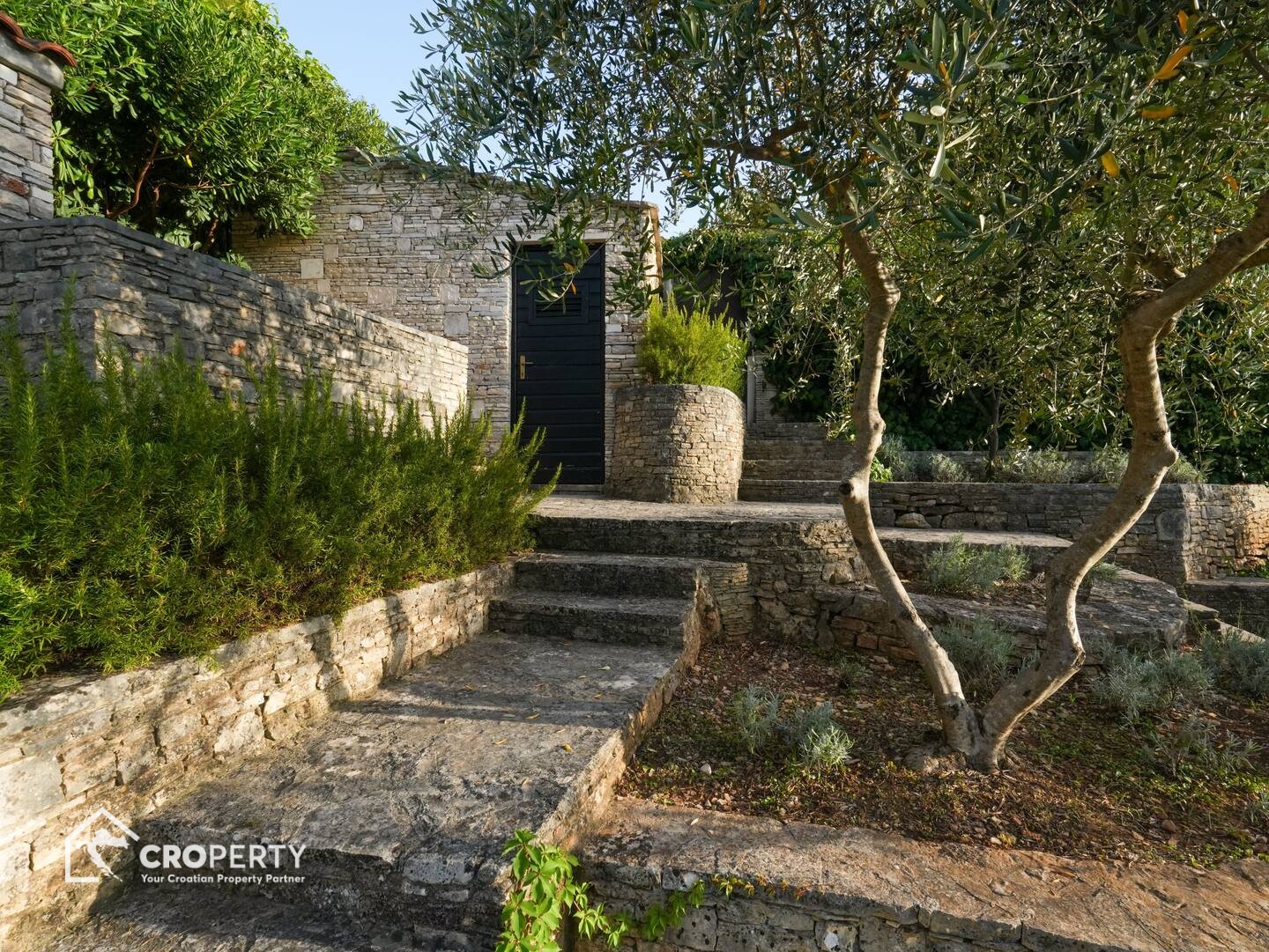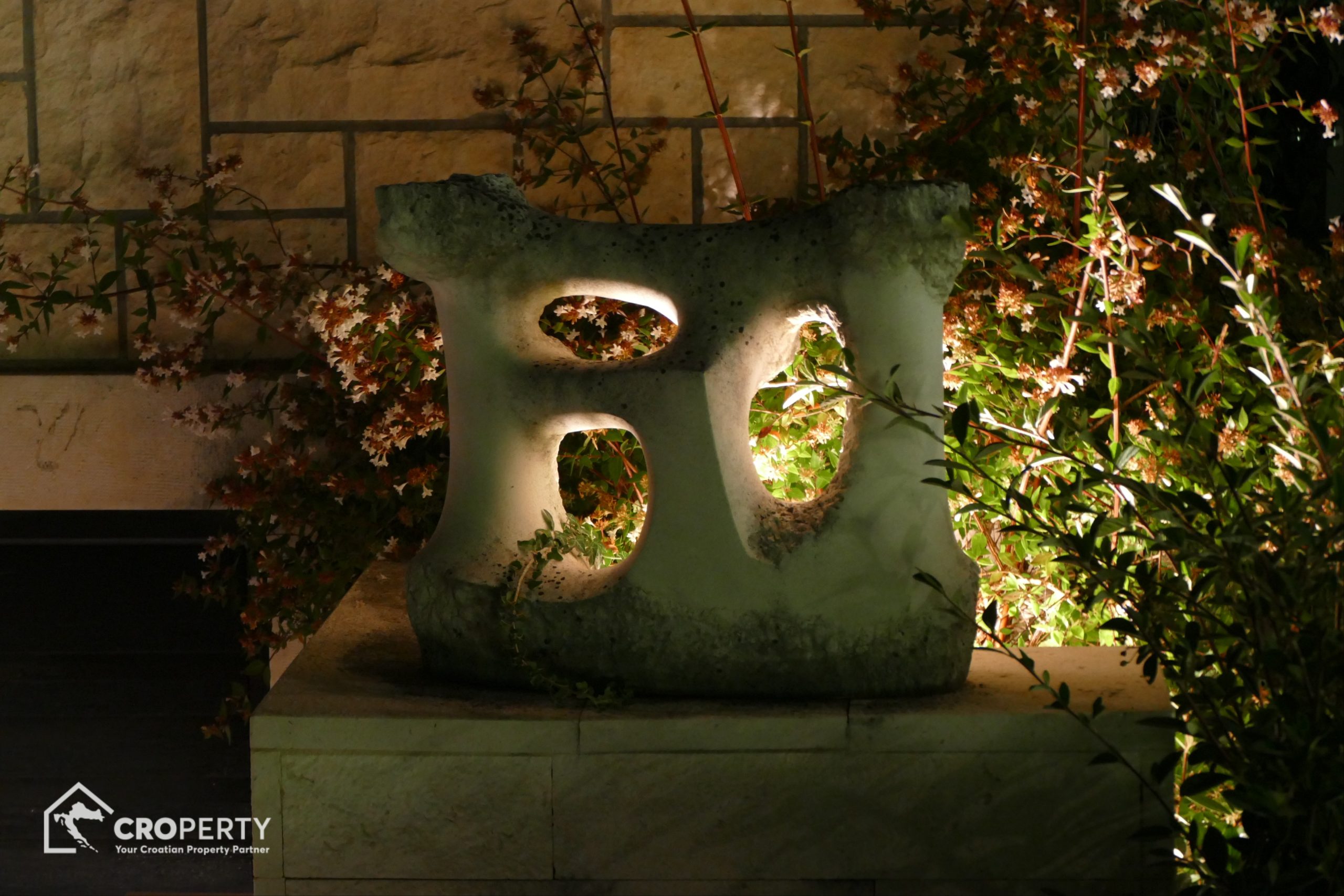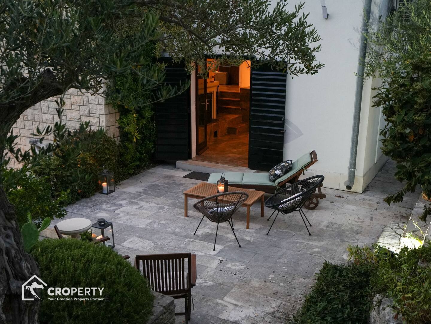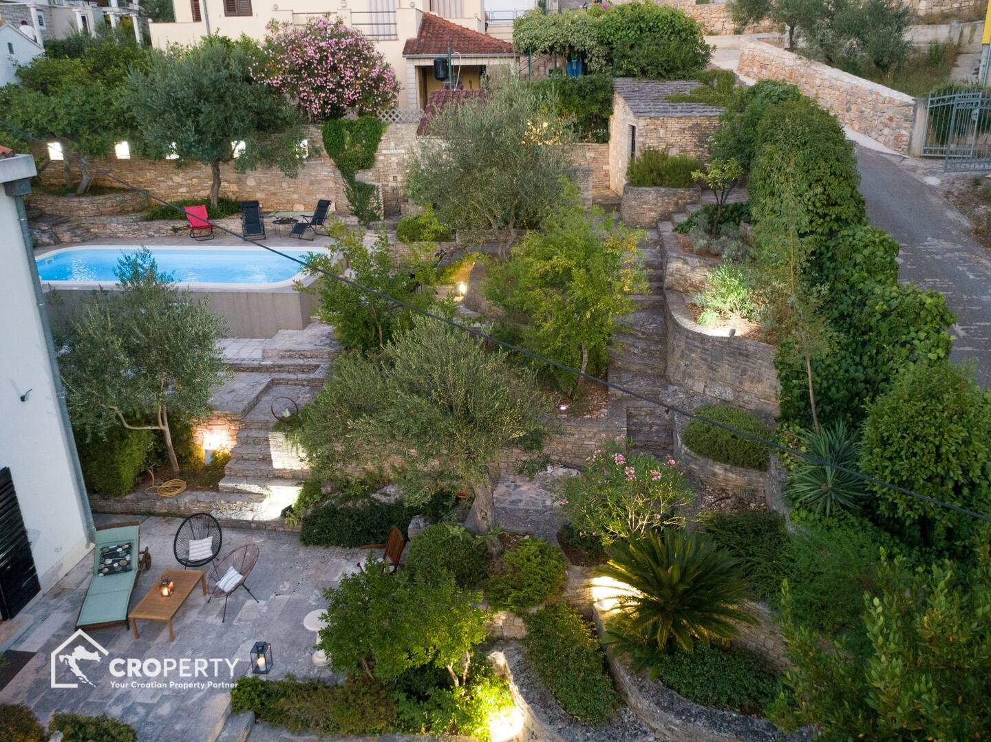 Vanjski prostor je visokim ogradama u kombinaciji zidova i zelenila zaštićen od vanjskog pogleda. Kaskadno je uređen s likovno pomno sazidanim kamenim zidovima na temu uredne suho-zidne gradnje i s kamenim podovima te hortikulturno uređenim vrtom. Uz to u vrtnom djelu postoji pet stabala maslina, te po jedna voćka limuna mjesečara, naranče, grejpa, kunkvaja, smokve, planike i tri stabljike kivija. Glavni ulaz (postoji i pomoćni) natkriven je divljom i pitomom lozom bijelog grožđa.