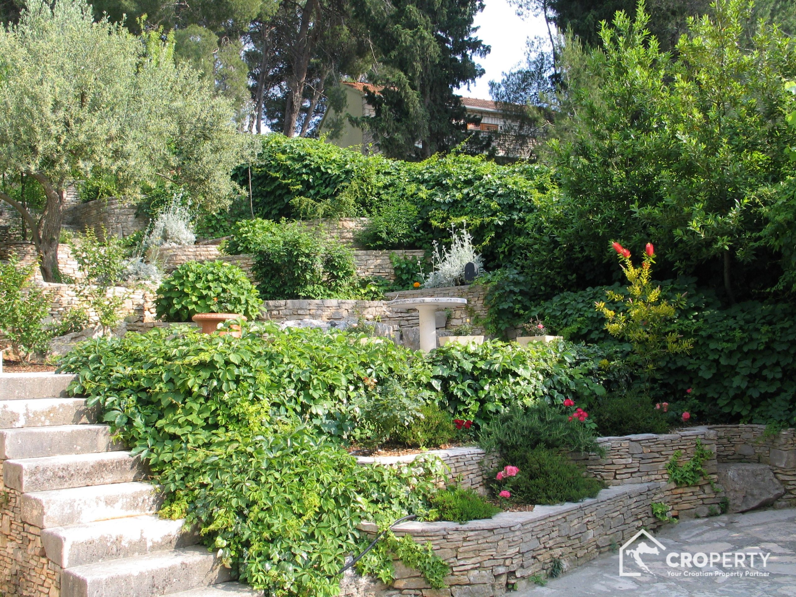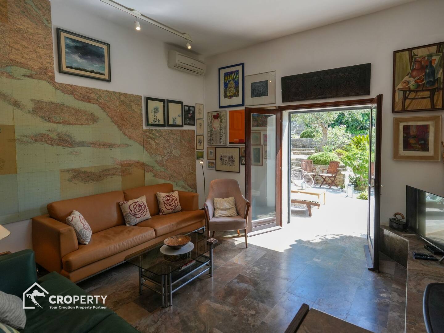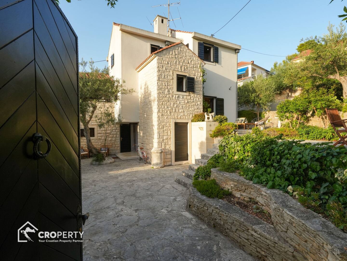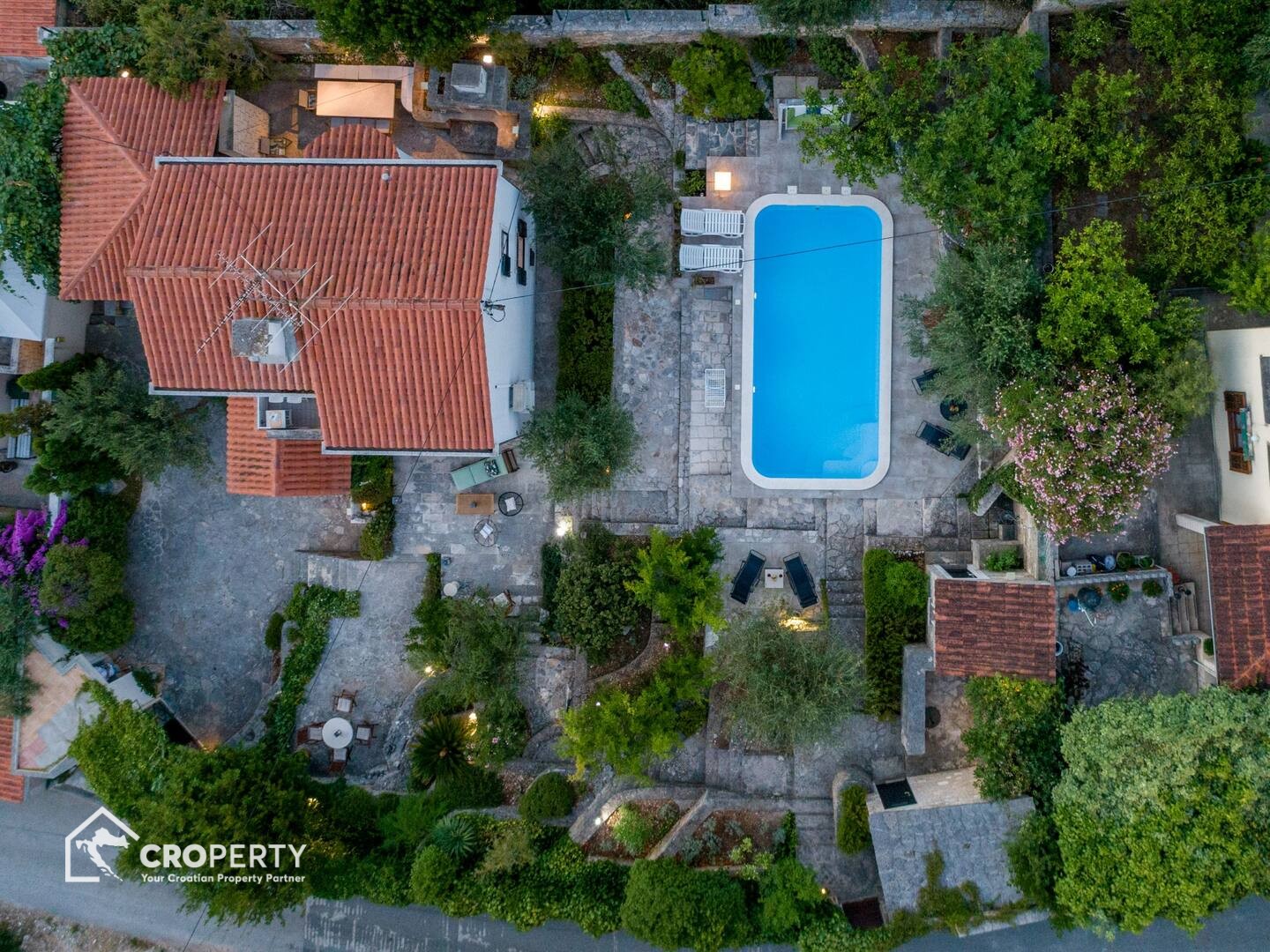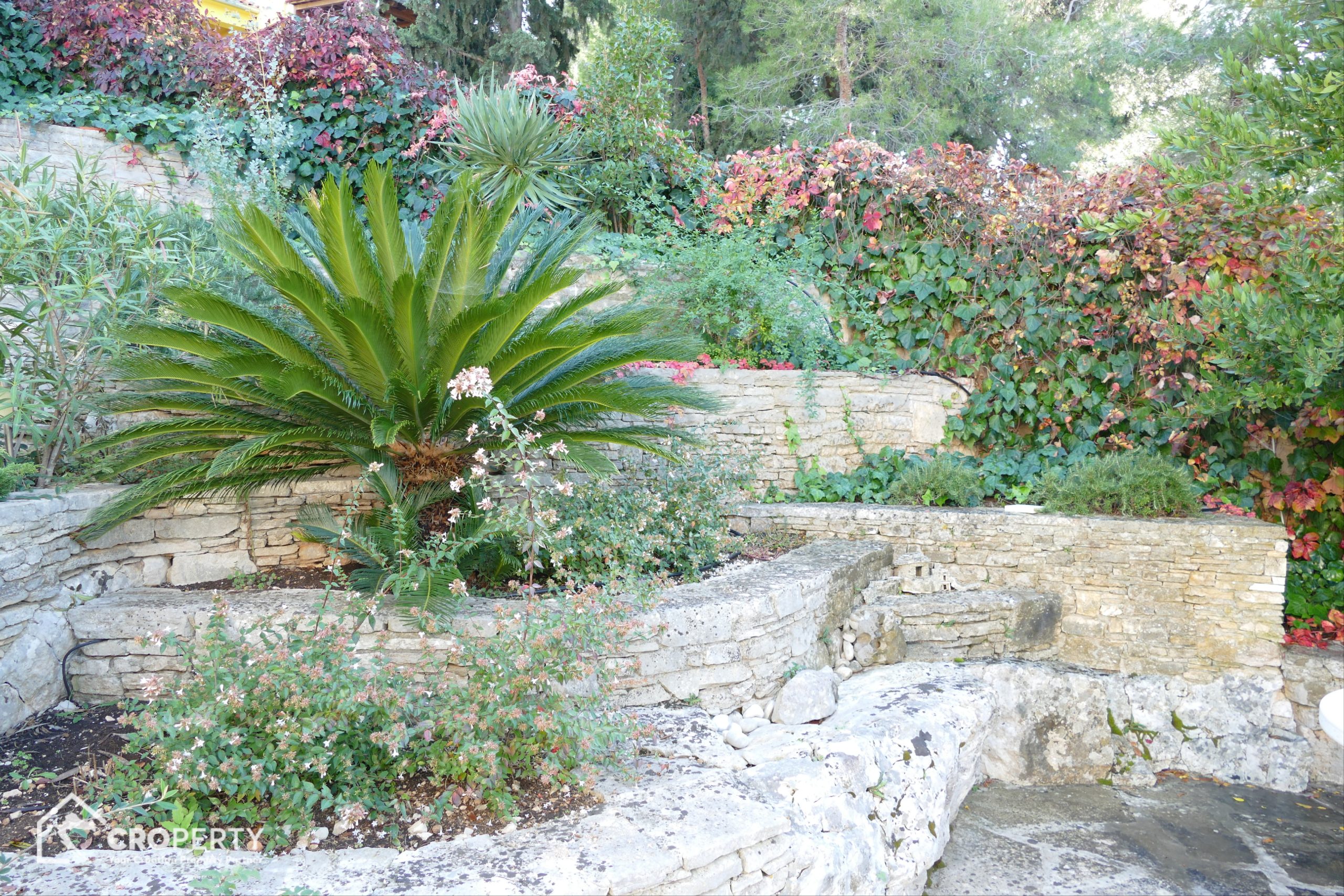 Vanjski prostor je visokim ogradama u kombinaciji zidova i zelenila zaštićen od vanjskog pogleda. Kaskadno je uređen s likovno pomno sazidanim kamenim zidovima na temu uredne suho-zidne gradnje i s kamenim podovima te hortikulturno uređenim vrtom. Uz to u vrtnom djelu postoji pet stabala maslina, te po jedna voćka limuna mjesečara, naranče, grejpa, kunkvaja, smokve, planike i tri stabljike kivija. Glavni ulaz (postoji i pomoćni) natkriven je divljom i pitomom lozom bijelog grožđa.