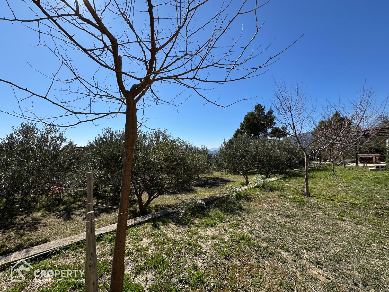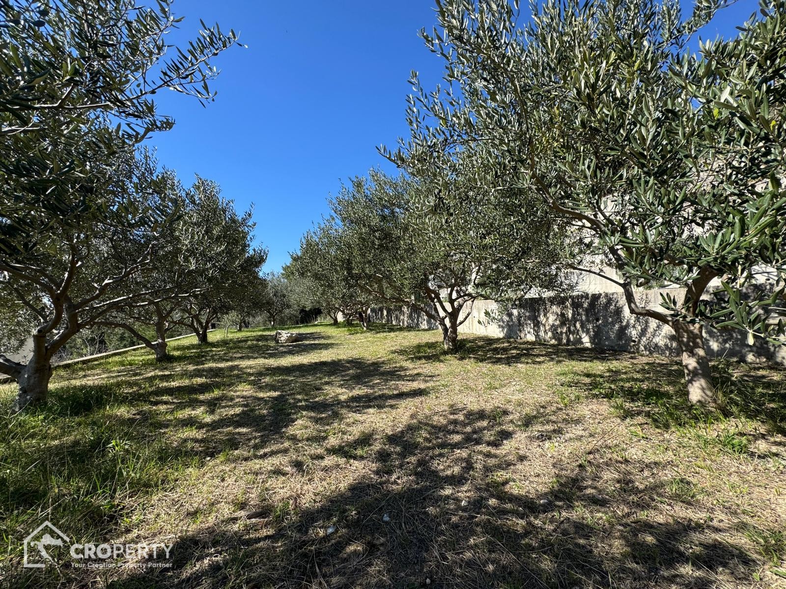 Ispred se nalazi sjedeća garnitura pod nadstrešnicom i dodatna tenda. Okruženje je maslinik od 26 maslina koje svake godine daju urod i zadnji je bio 30 litara kvalitetnog maslinovog ulja. Iznad parcele osiguran je parking za četiri automobila.